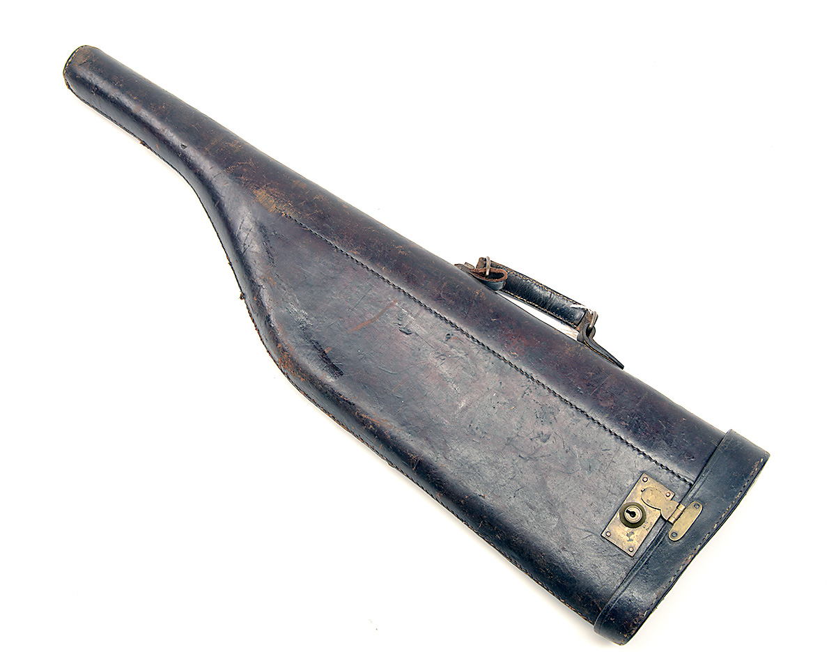 A LEATHER LEG-OF-MUTTON SINGLE GUNCASE, fitted for 30in. barrels, the interior lined with purple baize, brass lock (key missing0