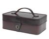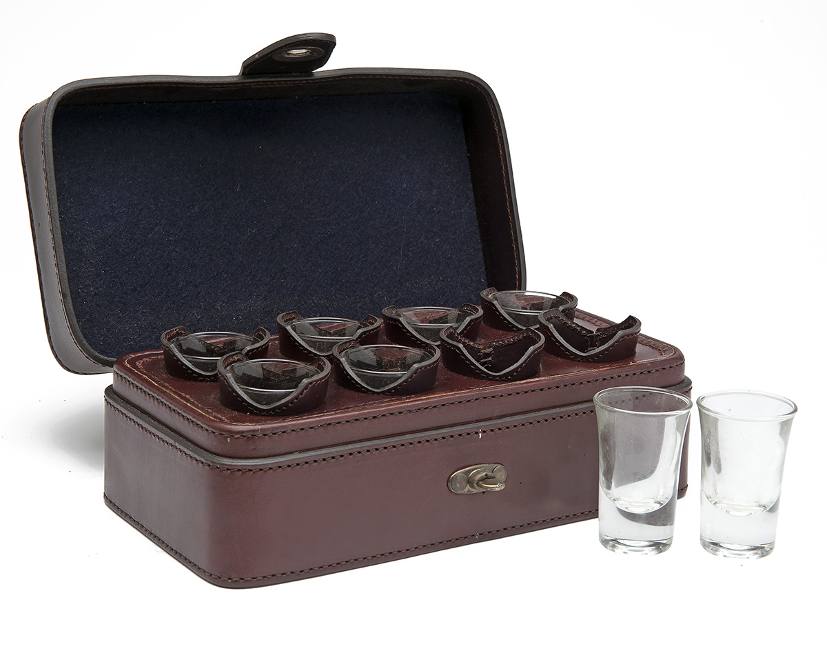 A NEW AND UNUSED BEST QUALITY LEATHER-CASED SET OF EIGHT SHOT GLASSES,