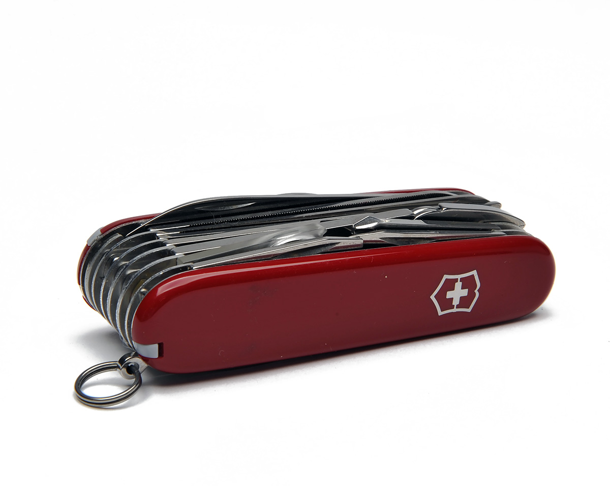 A COMPREHENSIVE SWISS ARMY KNIFE, possibly the Champion' model, with 19 individual blades and tools, some multi-purpose, appearing little used