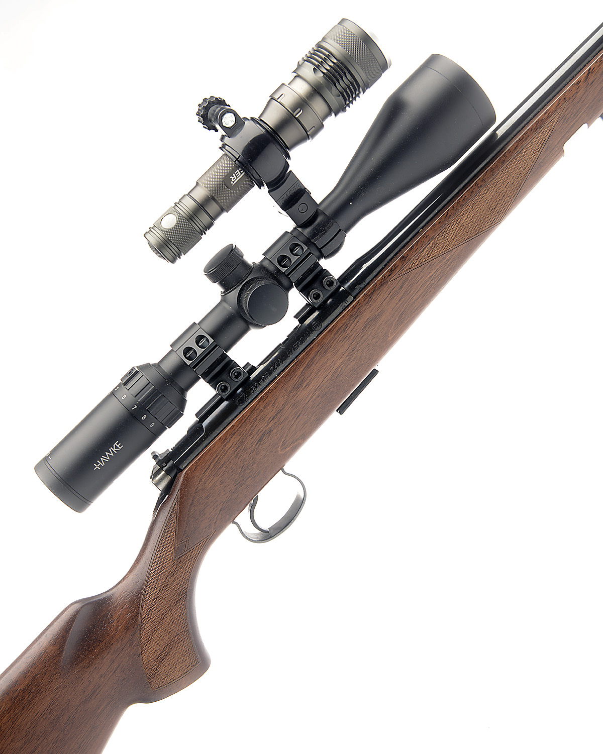 A LEFT-HANDED CZ .22 L.R. 'MODEL 452-2E ZKM' BOLT-MAGAZINE SPORTING RIFLE, serial no. B191364, 22 1/4in. nitro barrel, threaded for sound moderator, fitted with a Hawke 3-9x telescopic sight and a Tracer sight lite, manual safety, detachable magazine, 13 1/2in. pistolgrip stock, sling eyes, together with a sound moderator and a green canvas slip