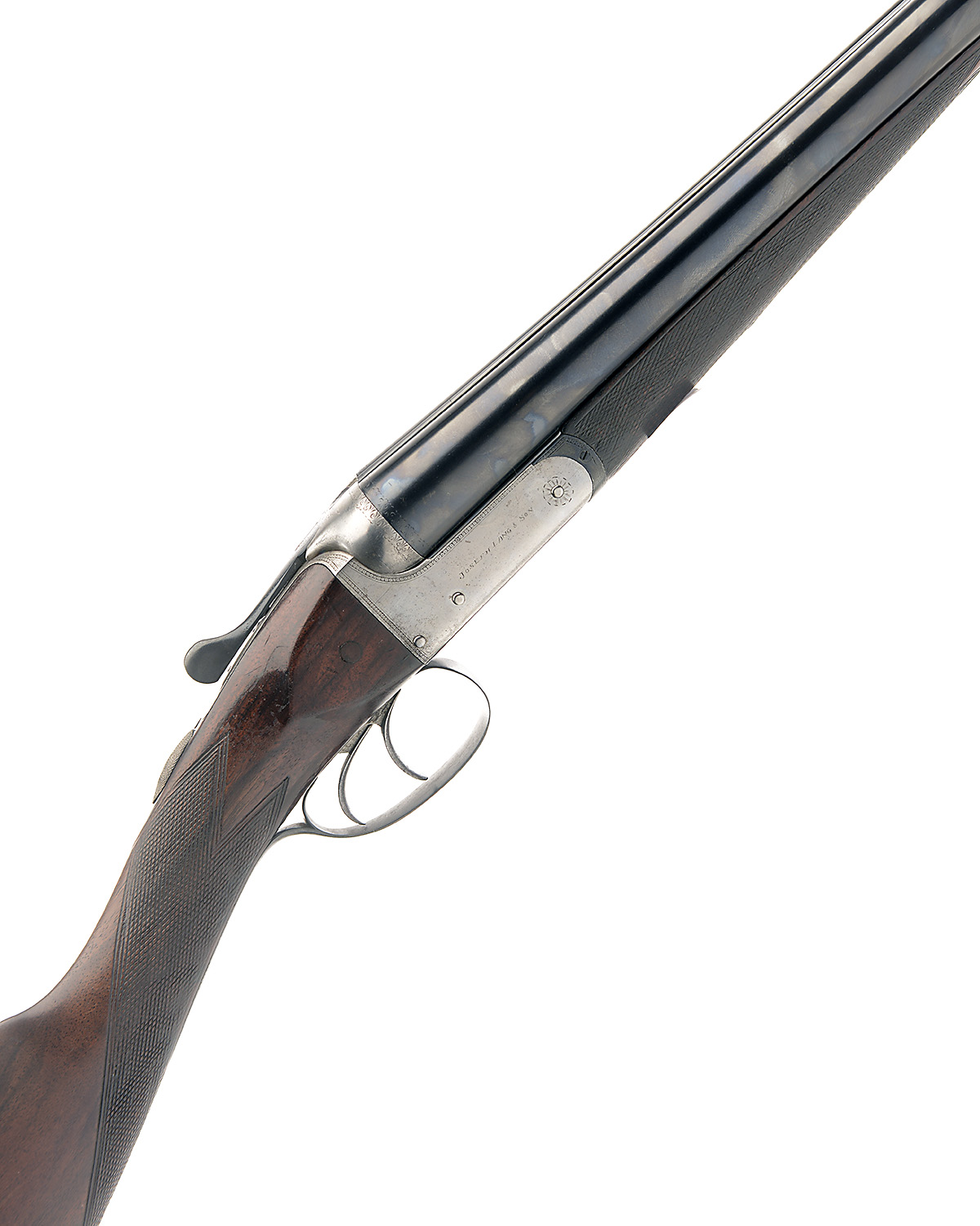 JOSEPH LANG & SON 12-BORE 'CROSSOVER' BOXLOCK EJECTOR, serial no. 14339, Circa 1907. 28in. nitro reproved barrels, the rib engraved 'JOSEPH LANG & SONS. 102 NEW BOND STREET. LONDON. W.' (barely legible), 2 1/2in. chambers, bored approx. true cyl. and 1/4 choke, treble-grip action, removable striker discs, automatic safety with gold-inlaid 'SAFE' detail, border engraving, brushed bright finish, 14 1/2in. crossover (right shoulder for left eye, pinned at head) stock including buttplate, weight 6lb. 6oz.