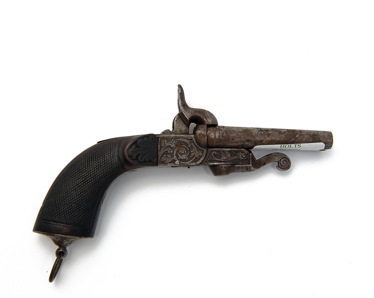 A 9mm PINFIRE DOUBLE-BARRELLED PISTOL, UNSIGNED, MODEL 'LEFAUCHEUX TYPE', no visible serial number, circa 1860, with tip-down 3in. side by side barrels, chisel engraved boxlock action with twin central hammers and folding triggers and chequered walnut butt, finish worn