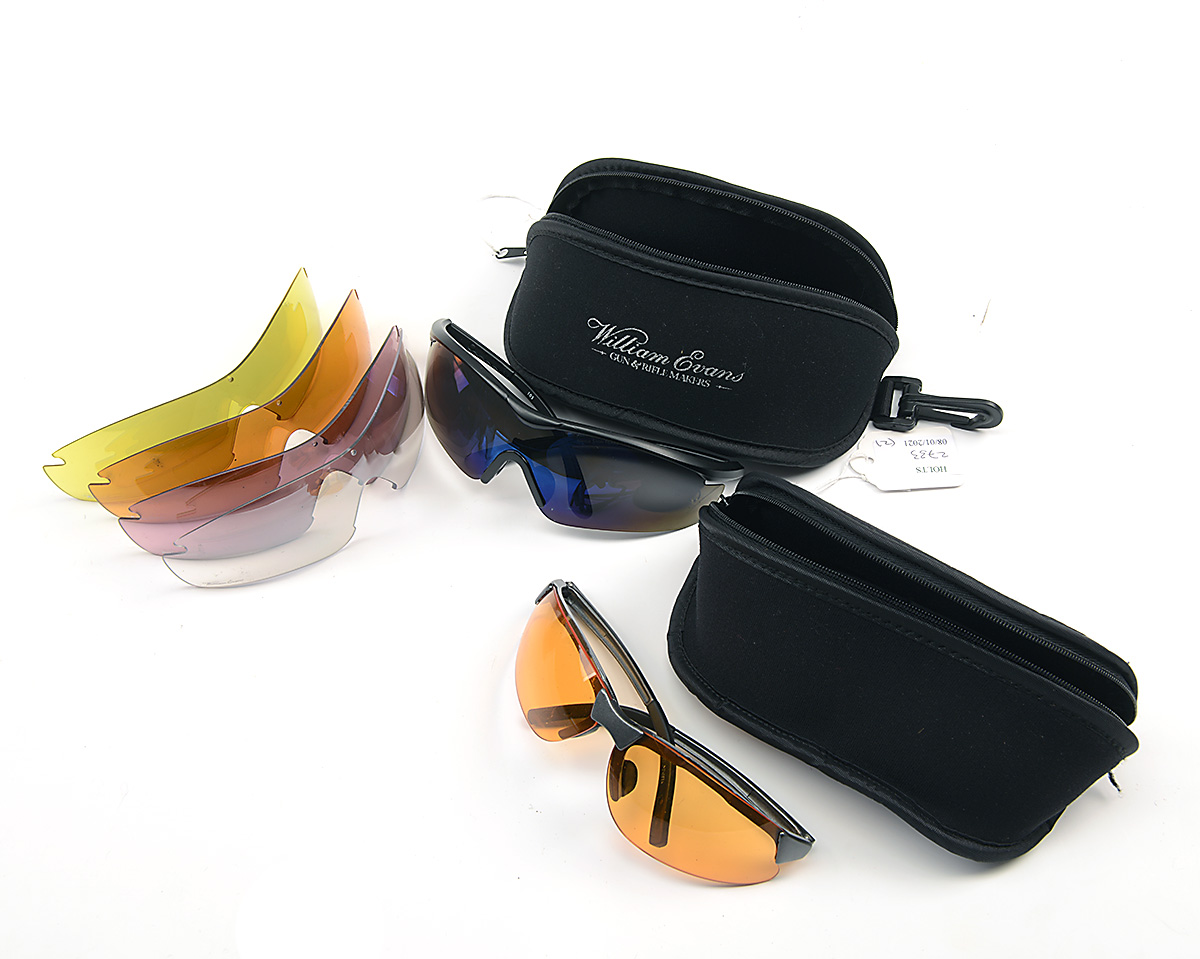 A SET OF WILLIAM EVANS SHOOTING GLASSES TOGETHER WITH A SET OF EYELEVEL SHOOTING GLASSES, both sets of glasses with interchangeable lenses and with cases