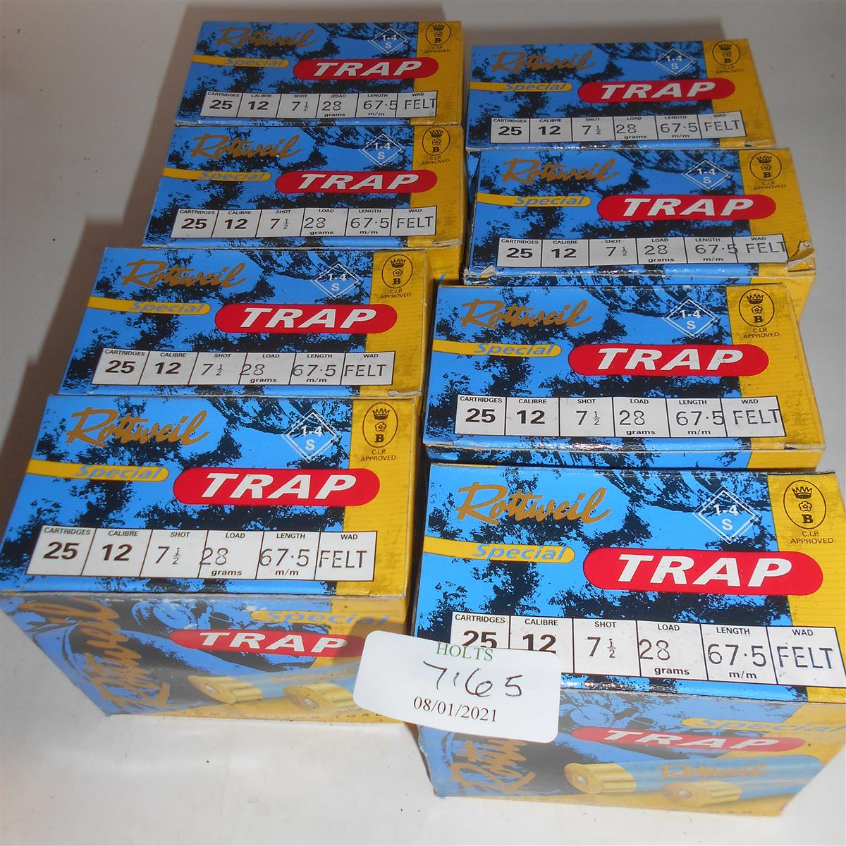 200 ROTTWEIL 12 BORE TIGER TRAP CARTRIDGES, 67.5mm, 28 grm. 7 SHOT, FELT WAD, Please be advised that ammunition, primers, primed cases, blanks and percussion caps cannot be sent to you by post or carrier. If you wish you can book a collection at one of our regional valuation days or collect from our offices at PE31 6HA in Norfolk