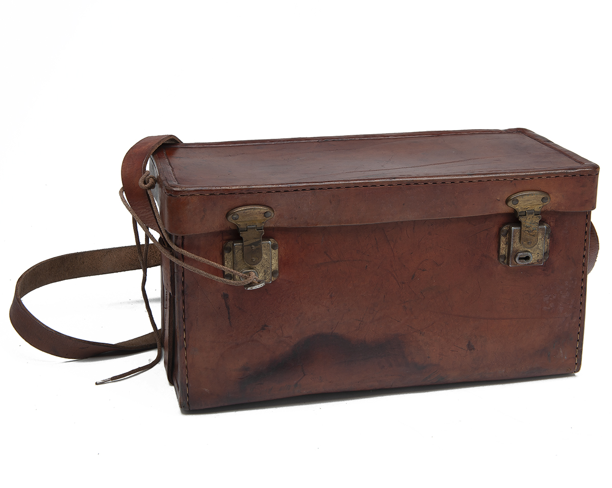 A COLLECTION OF VINTAGE SHOOTING RELATED ITEMS, comprising leather case with shoulder strap (has been used as a cartridge magazine) two brass lock (including key) together with canvas slip and leather cartridge belt