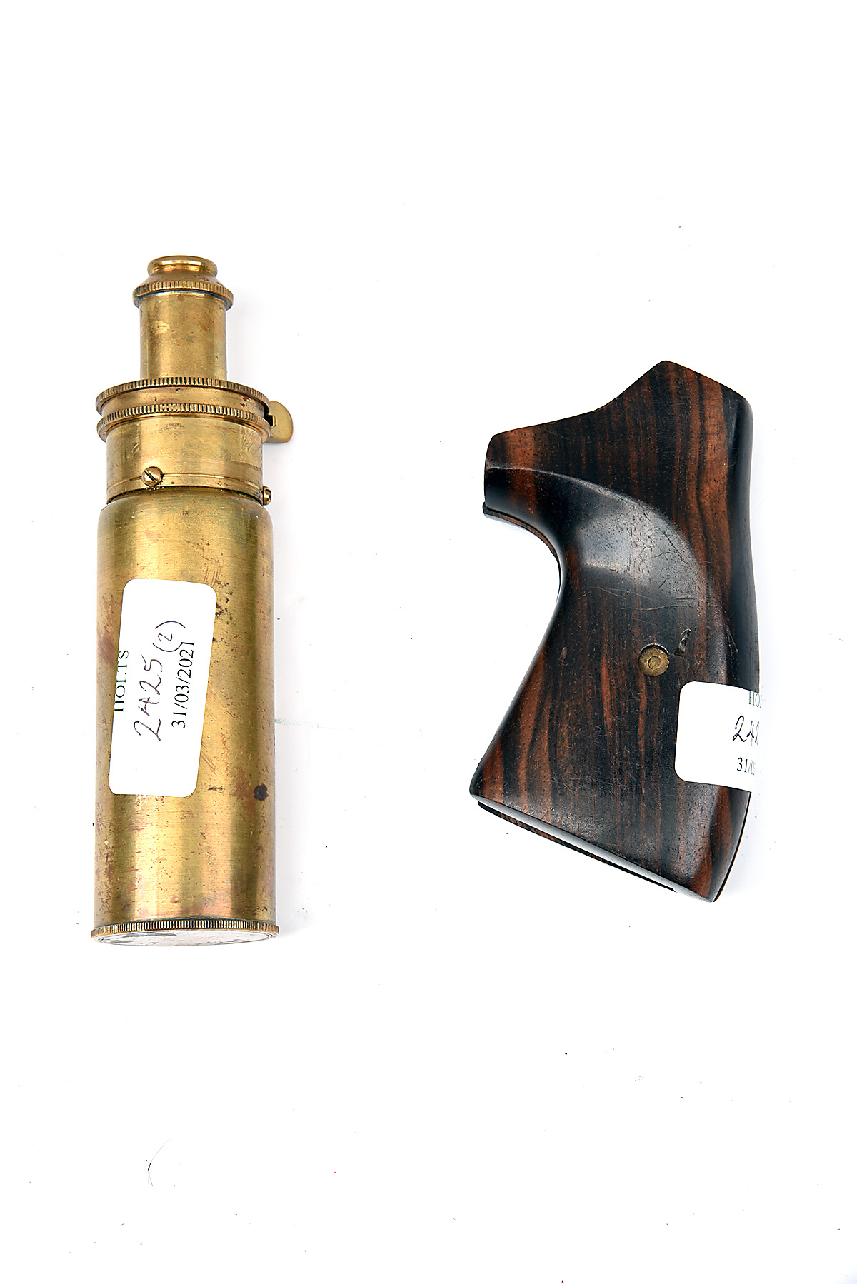 A REPRODUCTION CYLINDRICAL POWDER-FLASK SIGNED HAWKSLEY, TOGETHER WITH AN EXOTIC WOOD REVOLVER GRIP, the first all in brass with graduated spout, the second possibly for a mid-sized Smith & Wesson type