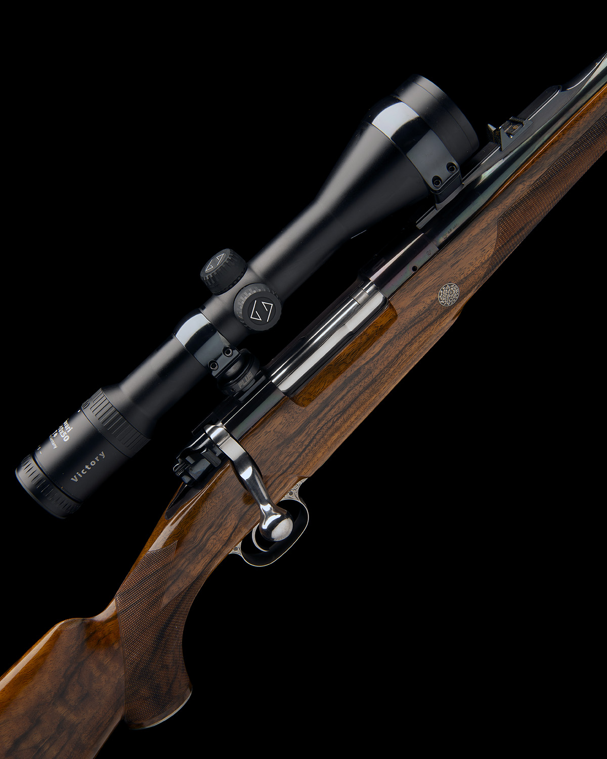20 3/4in. nitro reproved barrel (in 2020) engraved with the calibre designation in script, sight rib with open sights and folding leaf sight, chequered fronts with gold sight line detailing and gold-inlaid '50' and '100', ramp-mounted bead fore-sight, the receiver mounted with a Zeiss Victory Diavari 2,5-10x50 T* telescopic sight, serial no. 3049190, in quickly-detachable mounts, the receiver numbered 2376 and engraved 'DAKOTA ARMS 76 STURGIS, SD', florally engraved recoil blocks, hinged floorplate with push button release, the floorplate and triggerguard carved in high relief with fine floral and acanthus scrollwork on a matted background, with central engraving of 'E. MAYOR GENEVE. P481' with gold highlights, highly-figured pistolgrip stock with cheekpiece, sling eyes, engraved steel skeletal pistolgrip-cap and buttplate, 14in. pull, weight 7lb. 10oz. (unscoped) and 9lb. 3oz. (with scope)