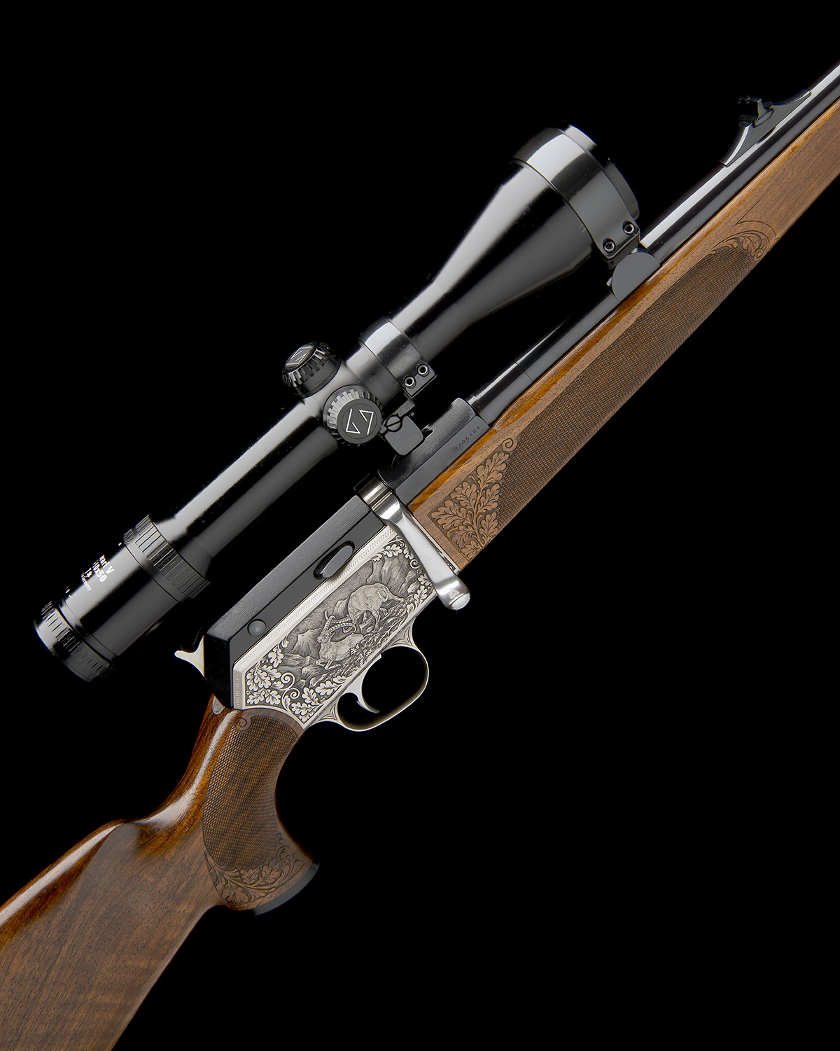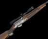 23 5/8in. nitro barrel with ramp-mounted open sights and ramp-mounted blade fore-sight, the breech end mounted with a Zeiss Diavari V 2,5-10x50 T* telescopic sight, serial no. 2310863, in quickly-detachable mounts, the action relief engraved with game scenes of mouflon and ibex surrounded by oak leaf and acorn designs, 14 1/2in. figured pistolgrip stock with sculpted cheekpiece, hogsback comb, sling swivels, oak leaf engraved ammunition trap, the pistolgrip-cap inset with an engraved oval with chamois, the chequering bordered with oak leaf designs, weight 7lb. (unscoped) and 8lb. 8oz. (with scope)