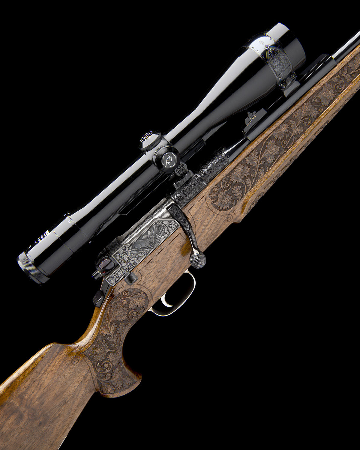 25 3/4in. nitro barrel carved at the breech end with oak leaves and acorns, open sights and ramp-mounted blade fore-sight, the breech end mounted with a Zeiss Diavari-Z 2.5...10x52 T* telescopic sight, serial no. 1744389, in quickly-detachable mounts, the rings carved with oak leaves and acorns, receiver and bolt relief engraved with further oak leaves and acorns surrounding game scenes of mouflon and ibex, figured pistolgrip stock with sculpted cheekpiece, hogsback comb, sling swivels, engraved ammunition trap, sculpted fore-part, finely carved at the butt, hand and fore-part with flowing oak leaf and acorn designs, weight 8lb. 5oz. (unscoped) and 10lb. 2oz. (with scope)