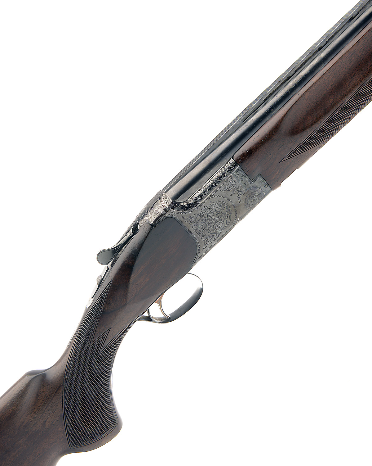 B.C. MIROKU 12-BORE SINGLE-TRIGGER OVER AND UNDER EJECTOR, serial no. 608378, 30in. nitro barrels with 10mm ventilated matt top-rib, 2 3/4in. chambers, bored approx. 3/4 choke in both, hold-open toplever, manual safety with integral barrel selector switch, beaded border and acanthus scroll engraving, blacked finish, 14 1/4in. pistolgrip stock including 3/4in. rubber recoil pad, weight 8lb. 8oz.
