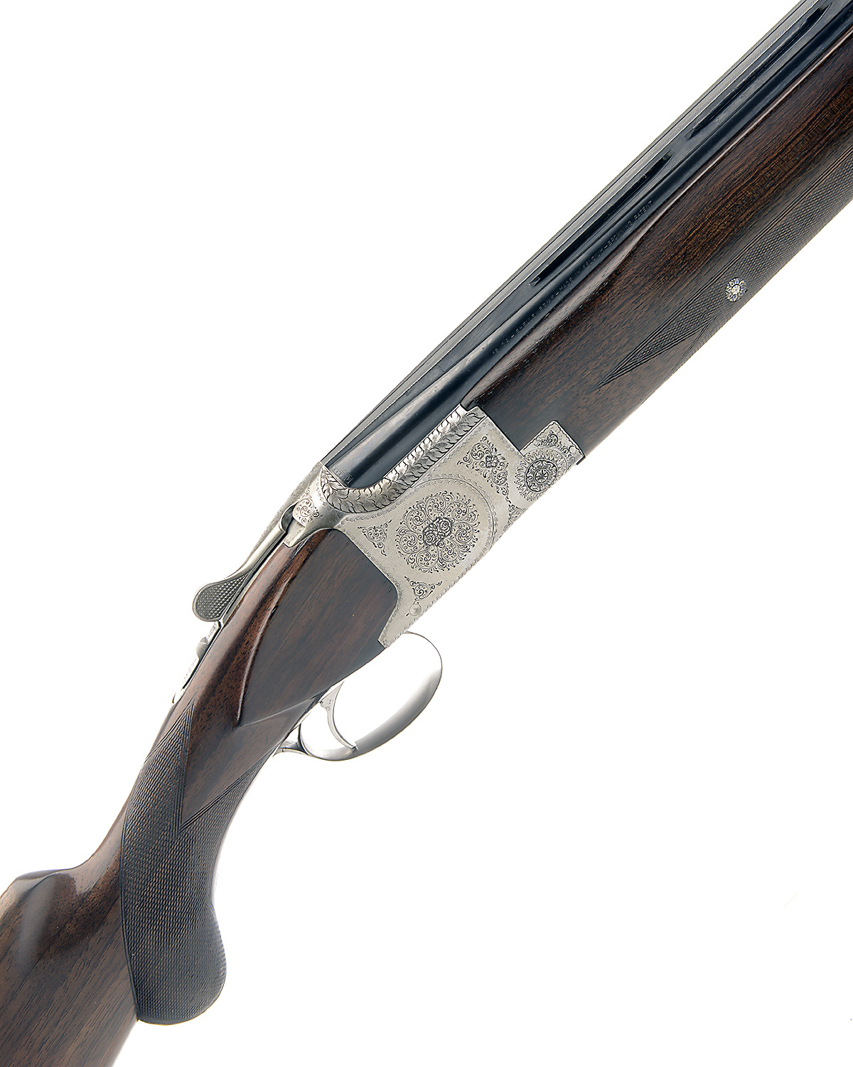 FABRIQUE NATIONALE 12-BORE SINGLE-TRIGGER OVER AND UNDER EJECTOR, serial no. 11124, 26 3/8in. nitro barrels with 16mm ventilated matt top-rib, 2 3/4ion. chambers, bored approx. imp. cyl. in both, hold-open toplever, manual safety with integral barrel selector switch, border and partial scroll engraving surrounding a central bouquet, 14 1/4in. semi-pistolgrip stock including buttplate, weight 7lb. 7oz.