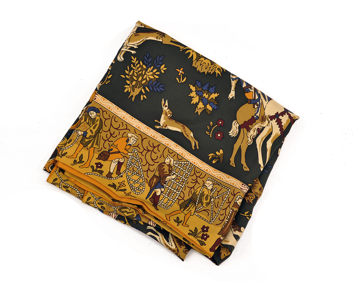 A HOLLAND & HOLLAND GAME SCENE SILK SCARF, green and gold colours, measuring approx. 32in. x 32in.