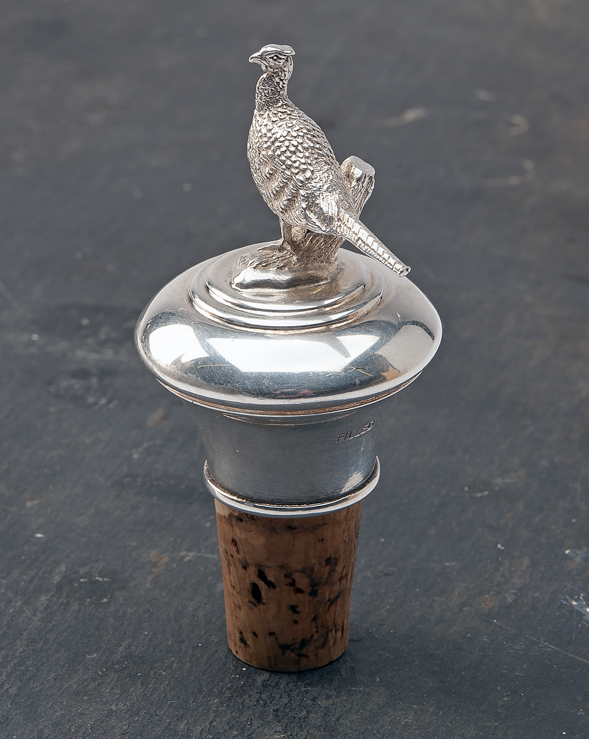 A STERLING SILVER PHEASANT TOP CORK BOTTLE STOPPER,