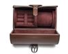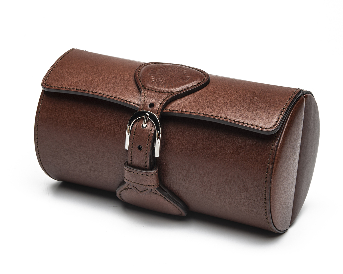 tan leather velvet-lined buckle fasten case, with internal velvet lift-out roll provisioned for a watch and cufflinks