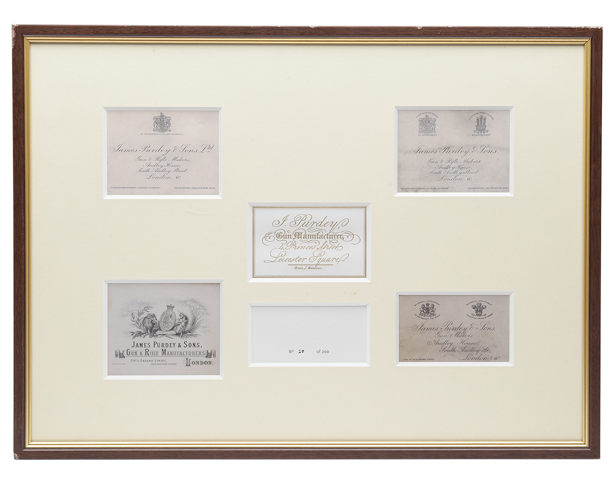 A FRAMED COLLECTION OF JAMES PURDEY & SONS TRADE / CASE LABELS,