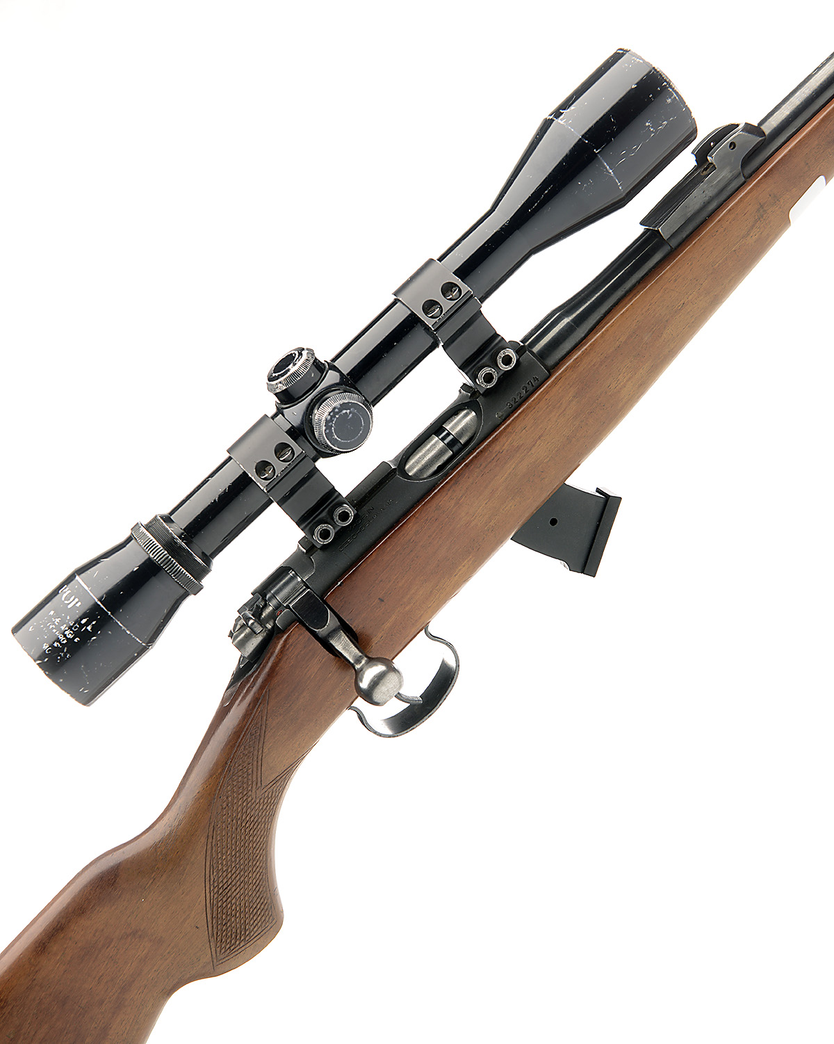 BRNO .22 L.R. 'MODEL 2' BOLT-MAGAZINE SPORTING RIFLE, serial no. 322274, 24 3/4in. nitro barrel, ramp-mounted fore-sight (blade missing), tangent rear-sight missing, fitted with a Sporter 4x40 telescopic sight, manual safety, detachable banana magazine, semi-pistolgrip stock, sling swivels