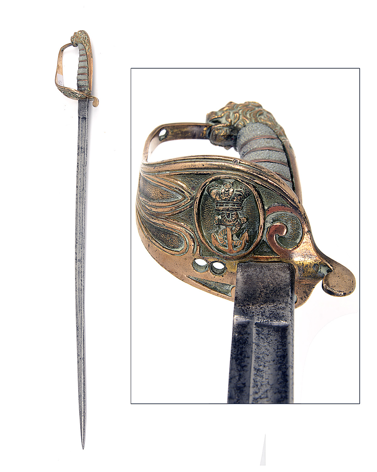 A BRITISH NAVAL ENSIGN'S LEVEE'S PATTERN SWORD, UNSIGNED, MODEL '1827 PATTERN', pre 1846 production with quill-tipped 24in. blade (cleaned, shallow pitting), solid gothic brass hilt with lionshead pommel and white fish-skin grip, no scabbard