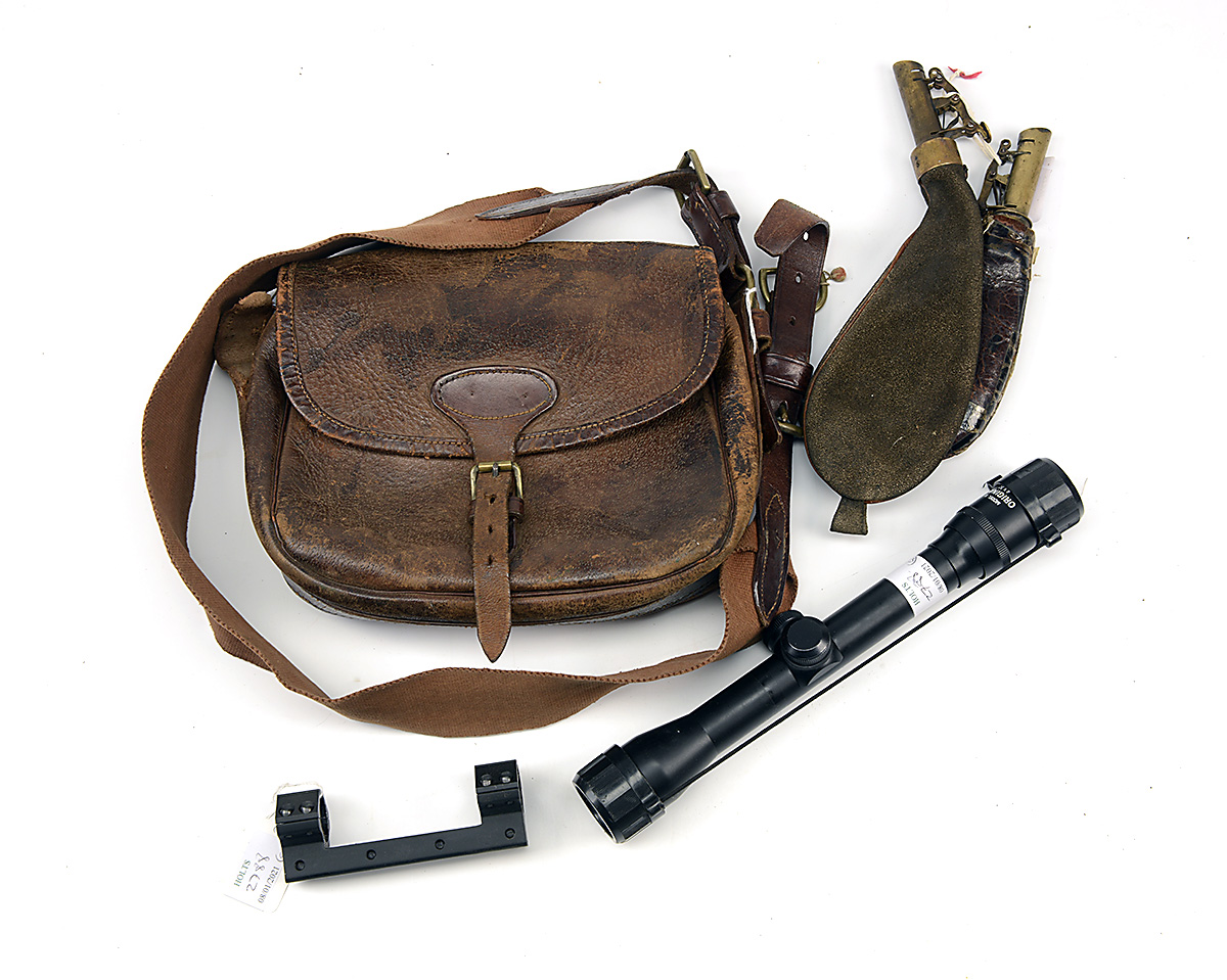 A COLLECTION OF SHOOTING RELATED ITEMS, comprising of a pigskin cartridge bag, an Original 4x32 telescopic sight, scope rings and mount, 2 x leather shot flasks