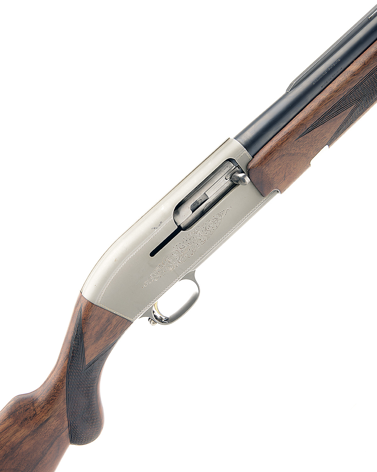 FABRIQUE NATIONALE 12-BORE 'TWELVETTE' 2-SHOT SEMI-AUTO SHOTGUN, serial no. A31021, 25 1/2in. nitro barrel with 7mm raised ventilated matt rib, 2 3/4in. chamber, bored approx. 1/4 choke, manual trigger safety gold-washed trigger, alloy action with zig-zag bordering and partial scroll engraving, 14 1/2in. semi-pistolgrip stock including rubber recoil pad, fore-end wood split and glued, weight 6lb. 14oz.