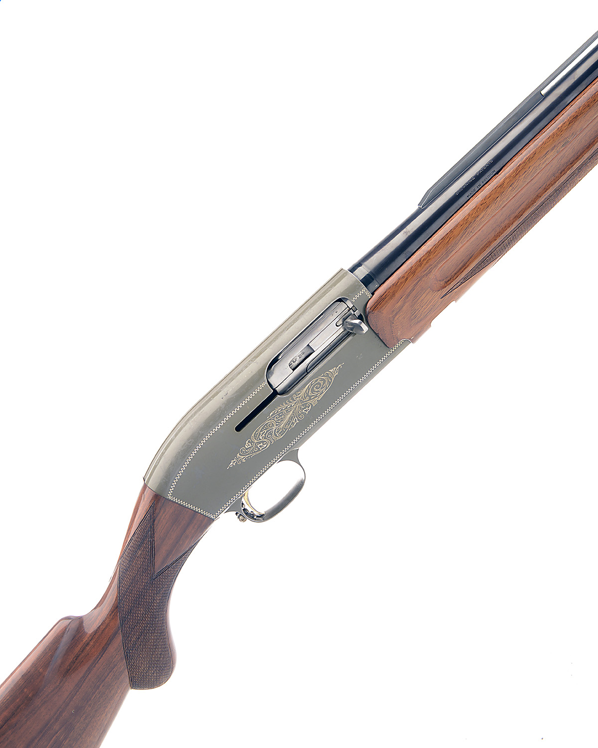 FABRIQUE NATIONALE 12-BORE (2-SHOT) 'TWENTYWEIGHT' SEMI-AUTO SHOTGUN, serial no. 2A43639, with spare barrel, 26 1/4in. nitro barrel with 7mm raised ventilated matt rib , 2 3/4in. chamber, bored approx. true cyl choke; spare 26 1/2in. nitro barrel with 7mm raised ventilated matt rib , 2 3/4in. chamber, bored approx. 1/4 choke serial no, 65817, manual roller trigger safety, gold-washed trigger, zig-zag bordering with partial scroll engraving, lightweight alloy action, 14in. semi-pistolgrip stock, weight 6lb. 8oz. (both barrels) (2)