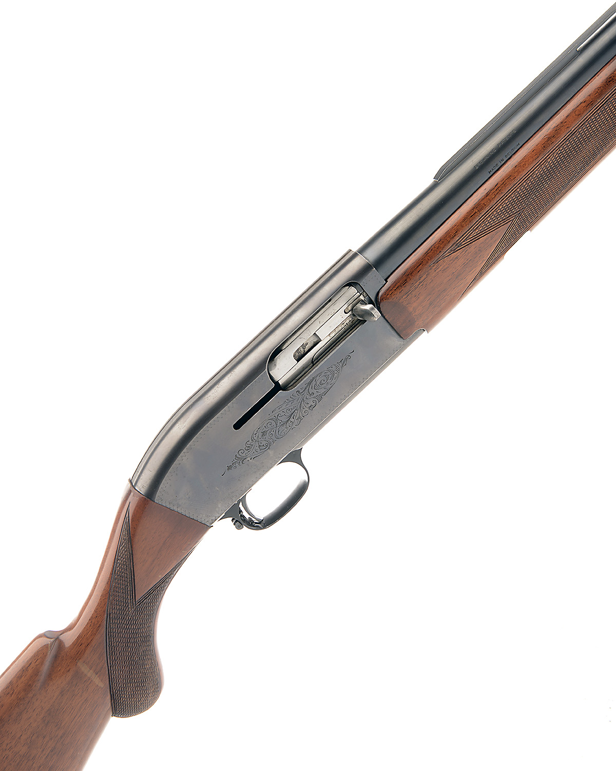 FABRIQUE NATIONALE 12-BORE (2-SHOT) SEMI-AUTO SHOTGUN, serial no. C23651, 29 1/2in. nitro barrel with 8mm raised ventilated matt rib, 2 3/4in. chamber, bored approx. full choke, manual roller trigger safety, blacked action with zig-zag bordering and partial scroll engraving, 14 1/2in. semi-pistolgrip stock including trademark buttplate, weight 8lb.