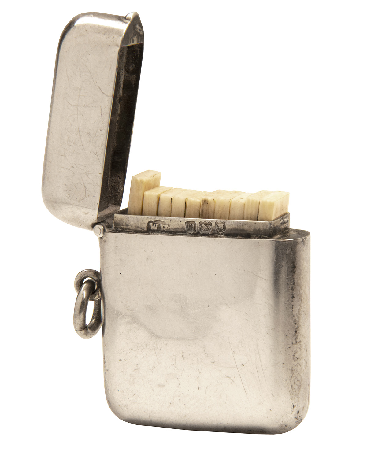 London hallmarks for 1907 and makers mark 'WH', hinged top opens to reveal ten numbered octagonal ivorine rectangular pegs, with suspension ring