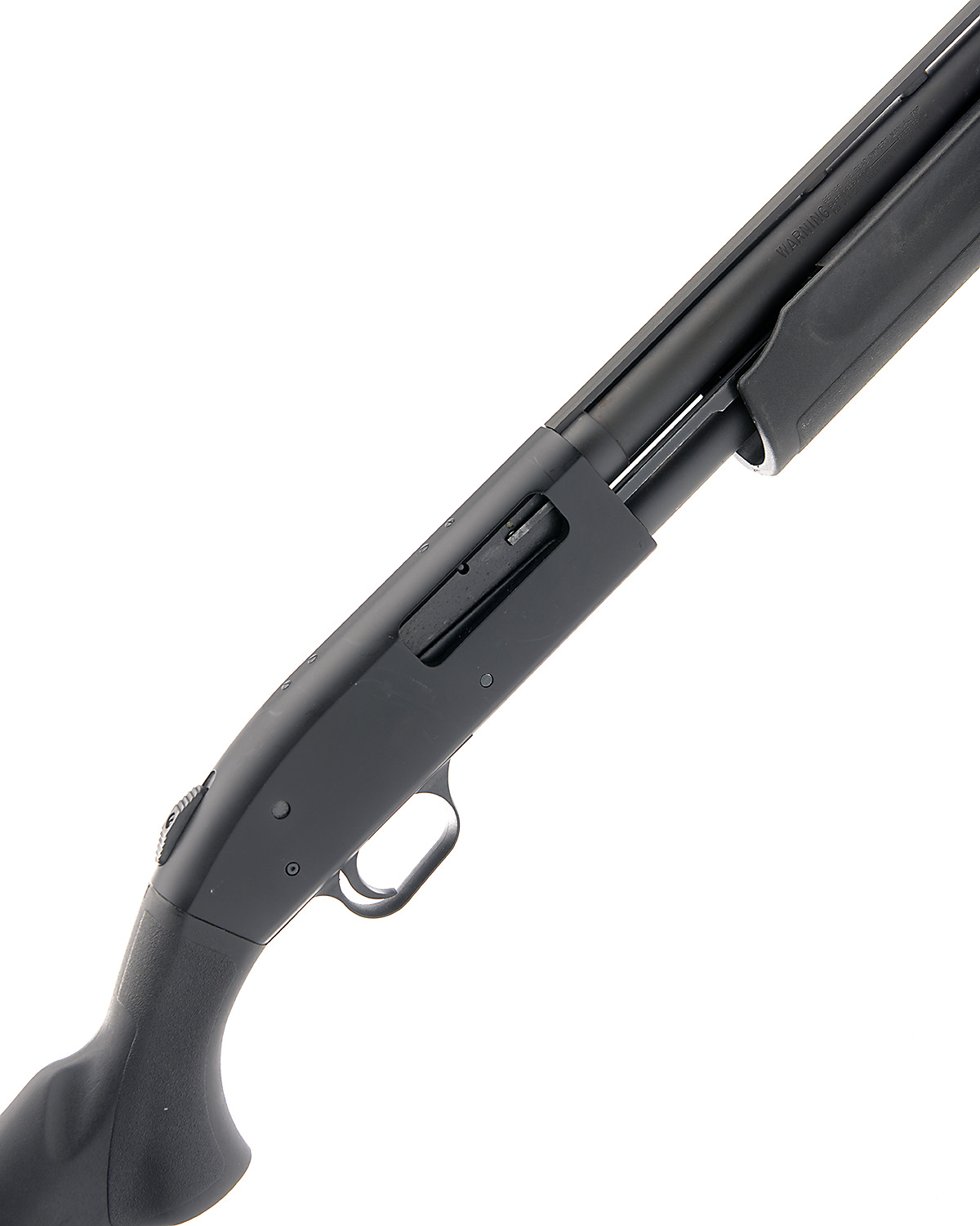 MOSSBERG 20-BORE (3IN.) 'MODEL 500' MODERATED PUMP-ACTION SHOTGUN, serial no. T644464, restricted magazine, 35 1/4in. nitro barrel including sound moderator, 9mm ventilated matt rib, 3in. chamber, manual top-tang safety, plain blacked action, 13 3/4in. synthetic pistolgrip stock including ventilated rubber recoil pad, sling swivels, weight 8lb. 3oz.