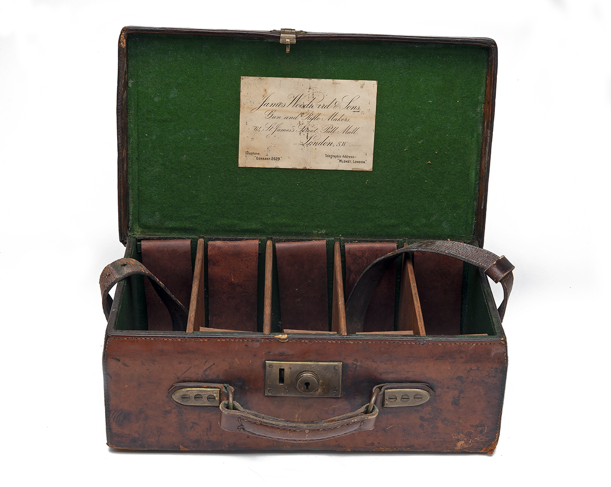 for approx. 250 cartridges, the interior lined with green baize, a James Woodward & Sons trade label, four oak dividers, four leather lifters, brass lock (key missing)