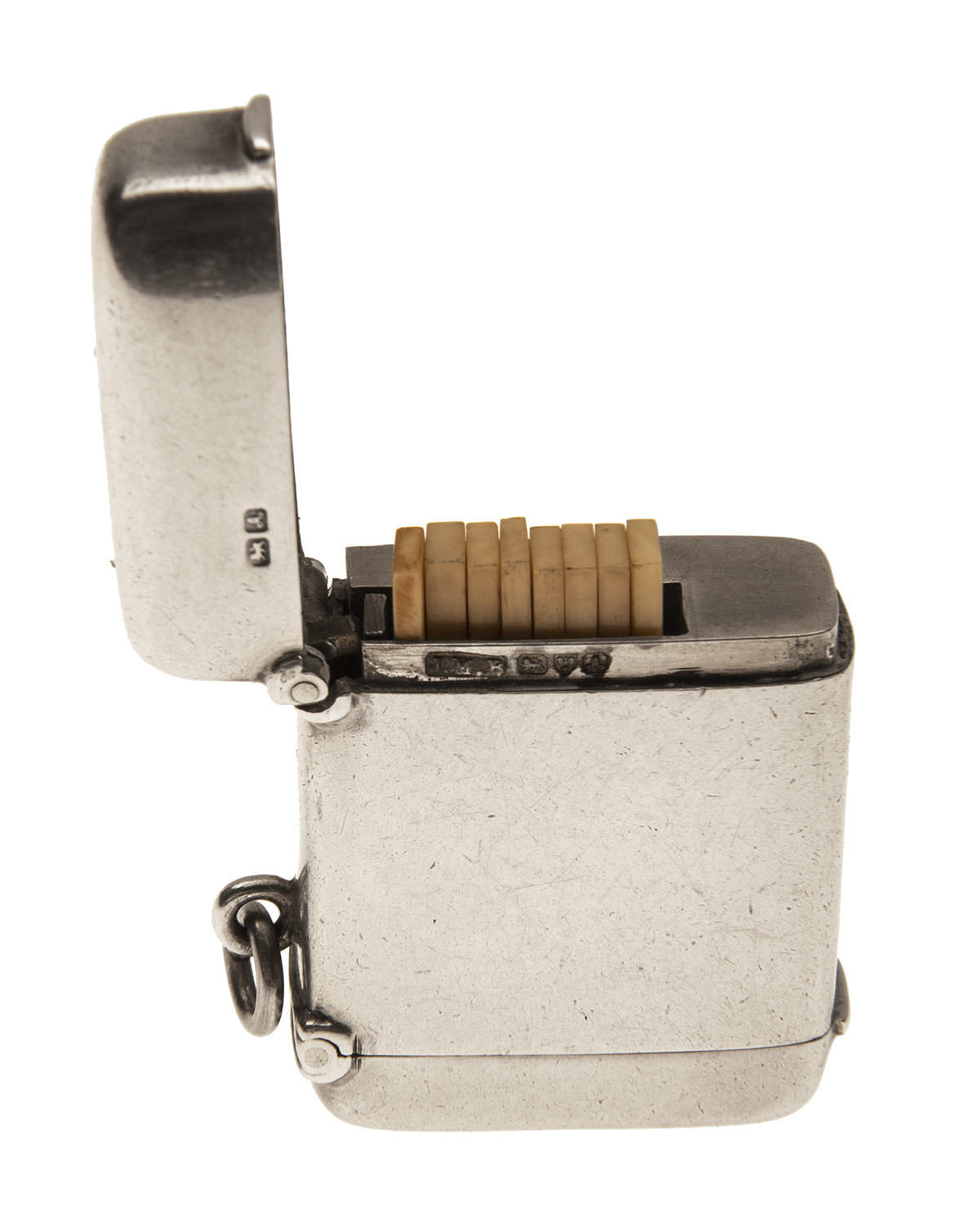 Chester hallmarks for 1901, 'J.M.B.' makers mark (1863-1926), sprung hinged top and bottom, the top opens to reveal eight numbered ivorine rectangular markers, the bottom (with striker) with match compartment, with suspension ring