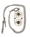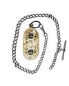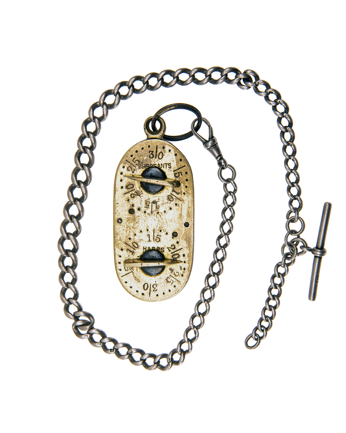 in brass and nickel finish, four ratchet dials, the front and rear plates marked 'RABBITS', 'PARTRIDGES', 'PHEASANTS' and 'HARES', partially obscured by the dials, each dial numbered to 30 on the plates, with suspension ring, silver watch chain with London hall marks, the t-bar with makers mark 'S.S'