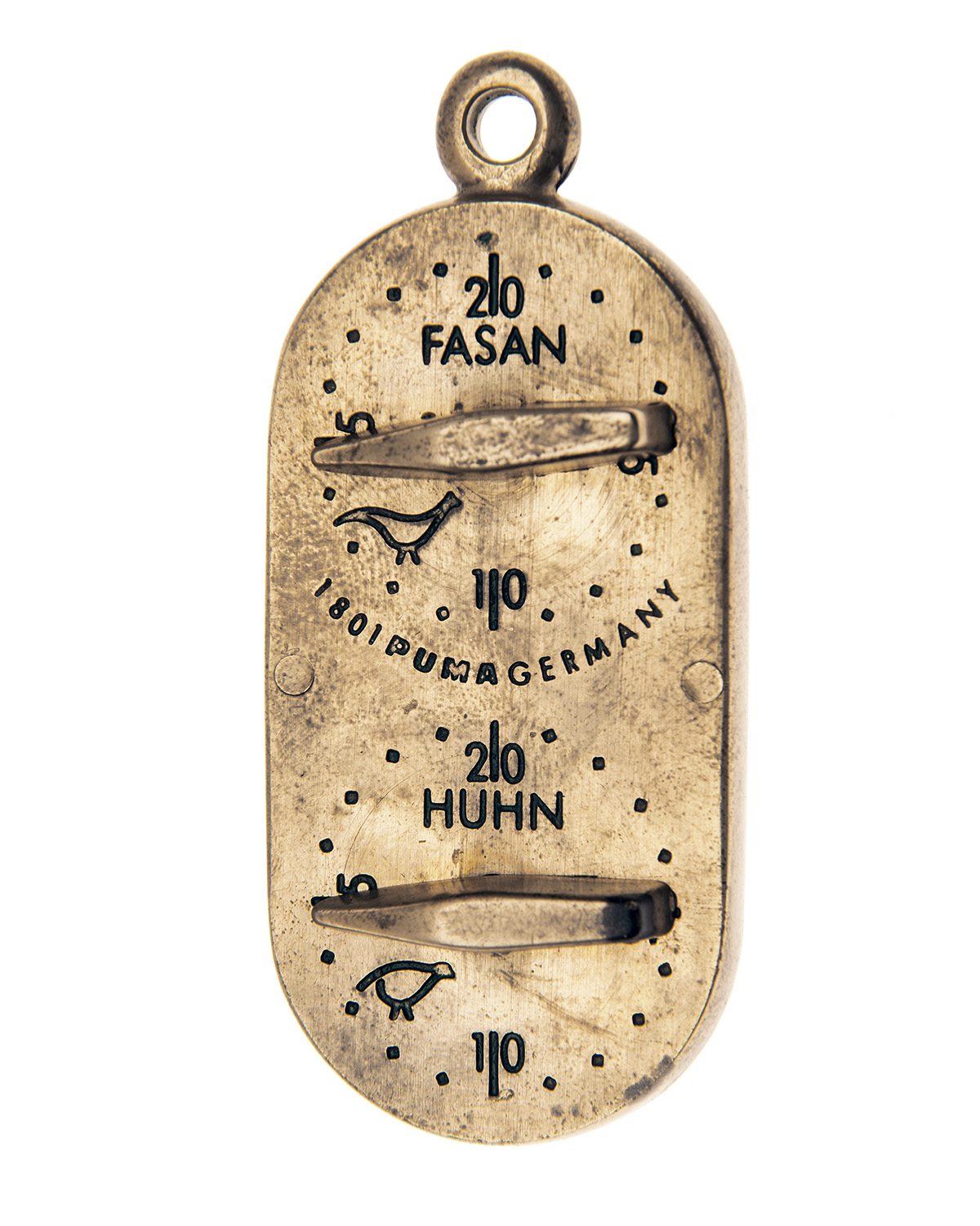 of 1980's manufacture, brass finish overall, four ratchet dials, the front and rear plates marked 'FASAN', 'HUHN', 'HAS' and 'KANIN', and each dial numbered to 20 on the plates and with a stylised depiction of the indicated quarry, centrally engraved '1801 PUMA GERMANY' and 'HABSBURGER STRECKENUHR', suspension ring