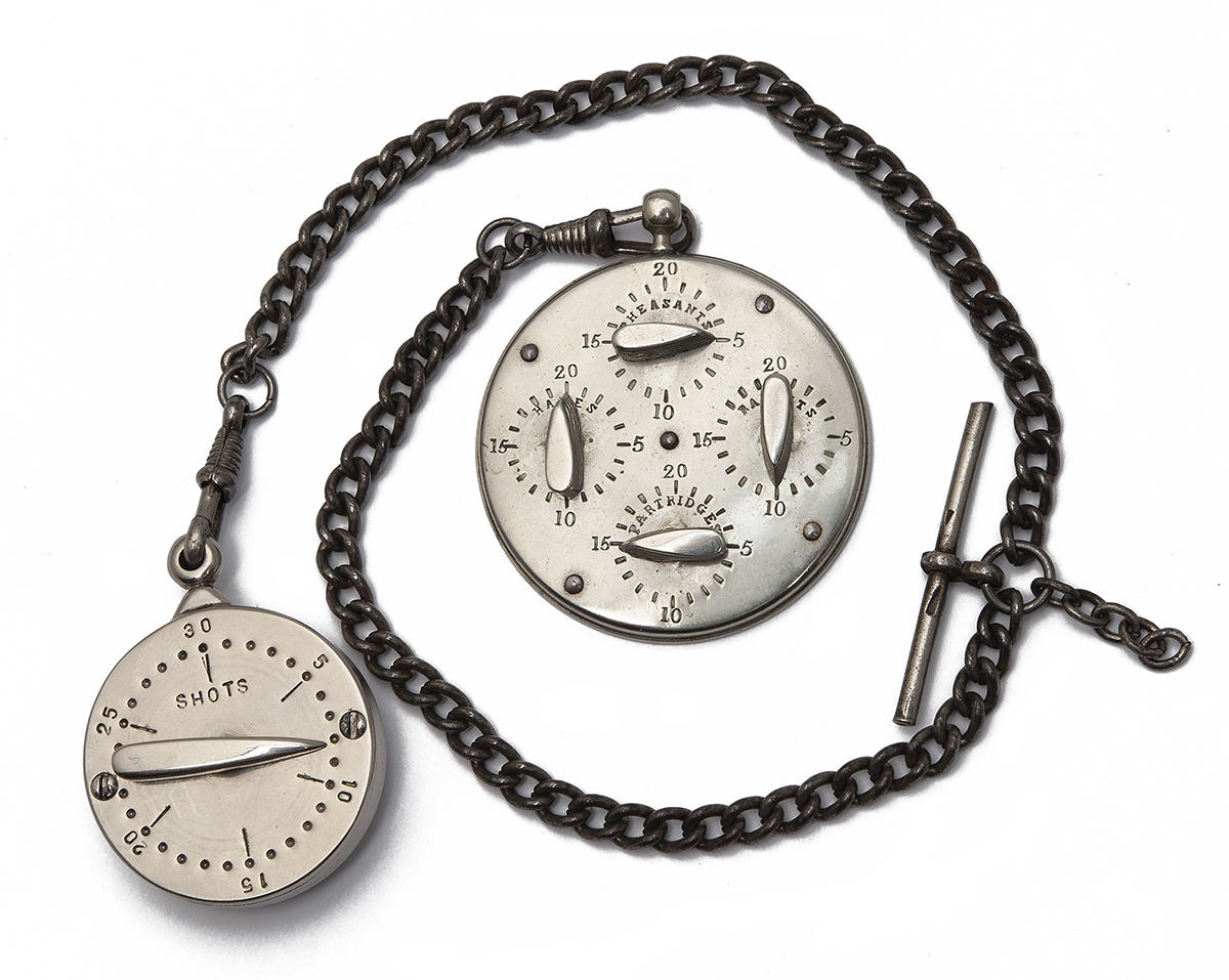 nickel finish overall, approx. 2in. diameter, the front plate with four ratchet dials marked 'PHEASANTS', 'RABBITS', 'PARTRIDGES' and 'HARES', the rear plate plain finish and engraved 'JAMES . DIXON & SONS. SHEFFIELD', suspension ring, with watch chain attaching to a modern nickel finish circular counter, dials to each side numbered to 20 and engraved 'SHOTS' to the obverse and 'KILLED' to the reverse, approx. 1 1/2in. diameter