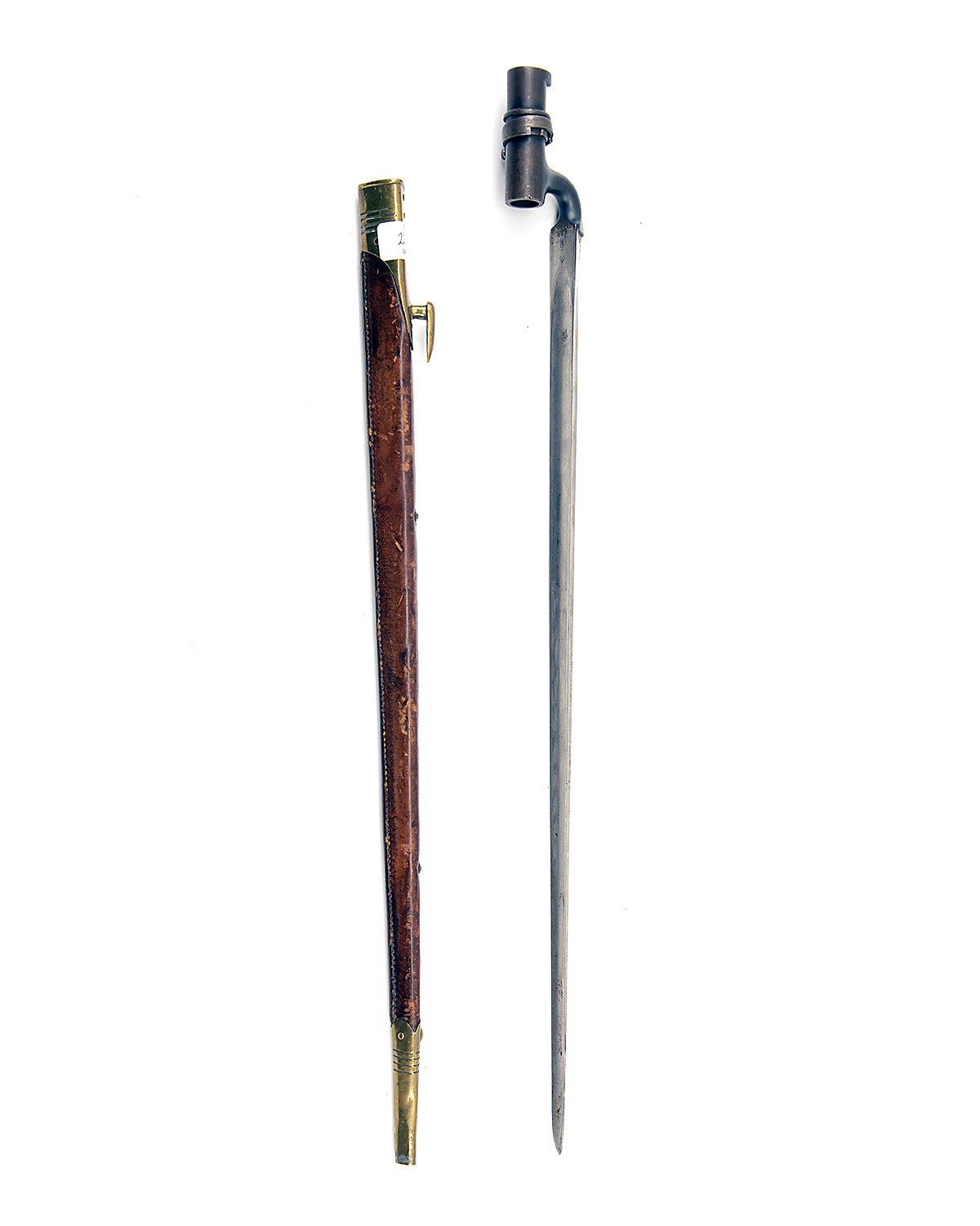 A GOOD 1876 PATTERN SOCKET-BAYONET FOR A MARTINI-HENRY RIFLE, dated for 1889, complete with its brown leather brass mounted scabbard