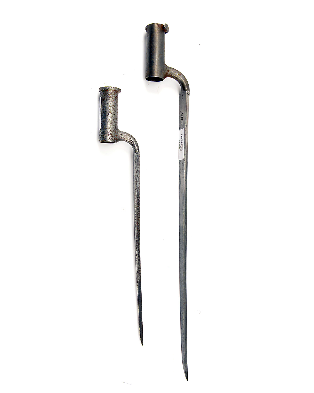TWO BRITISH SOCKET-BAYONETS, the firs a Cadet Pattern (pitted), the second for a BRown Bess musket and signed 'HILL', both missing scabbards