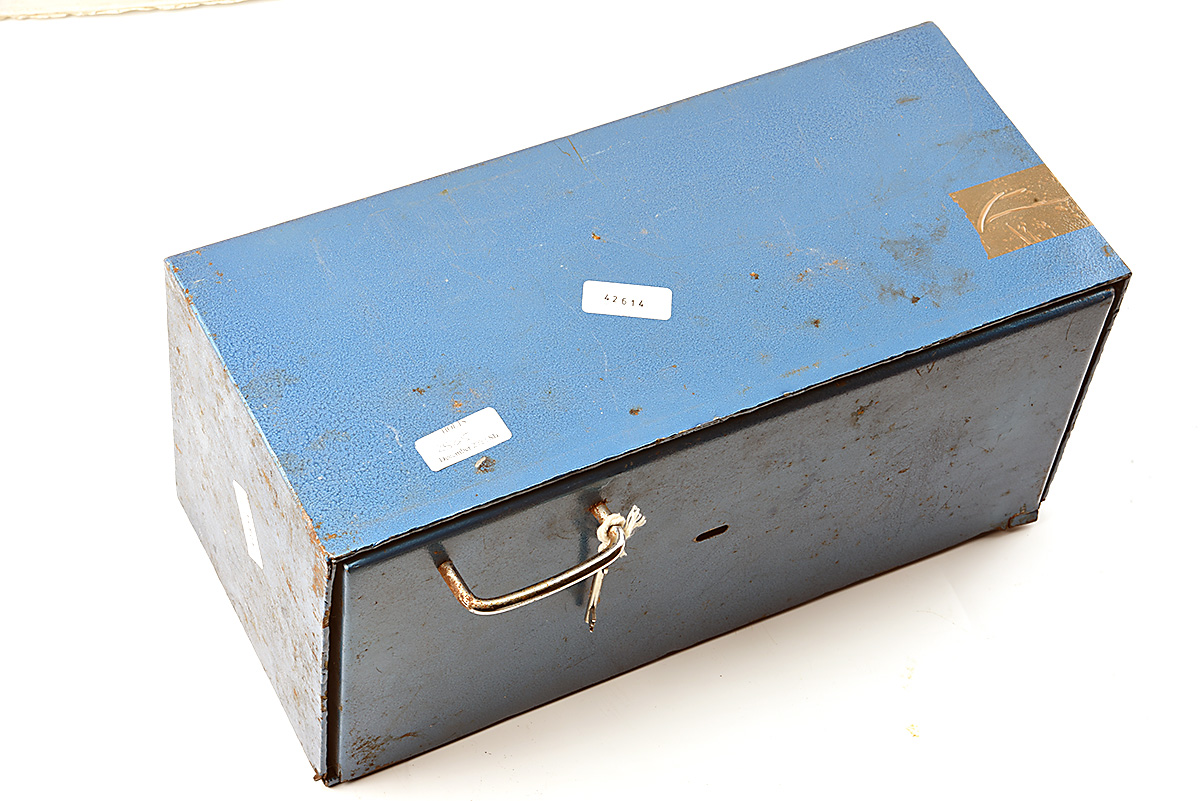 A SMALL STEEL AMMUNITION SAFE, 18in. x 8 1/2in. x 8in. Including one key.