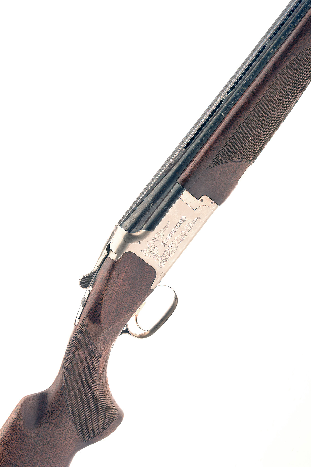 BROWNING 12-BORE '325' SINGLE-TRIGGER OVER AND UNDER EJECTOR, serial no. 59549NM, dated 1990, 30in. nitro barrels with 13mm ventilated matt top-rib, 2 3/4in. chambers, bored approx. 1/4 and 3/4 choke, hold-open toplever, manual safety with integral barrel selector switch, gold-washed adjustable single trigger, partial acanthus scroll engraving surrounding the makers name, the underside with the model designation, matt silver finish, 14 3/4in. pistolgrip stock (damage to chequering) including 1in. ventilated rubber recoil pad, weight 7lb. 7oz.