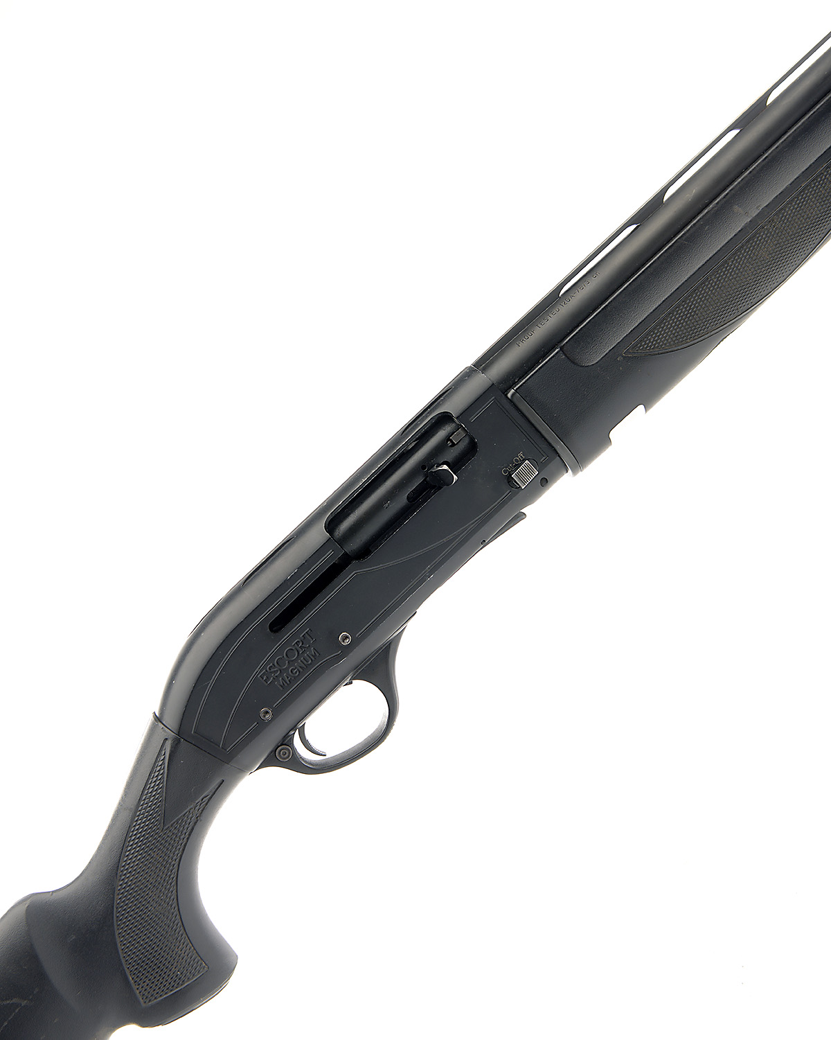 HATSAN 12-BORE (3IN.) 'ESCORT MAGNUM' SEMI-AUTO SHOTGUN, serial no. 387329, restricted magazine, 28in. nitro barrel with 7mm ventilated matt rib, 3in. chamber, multichoke (no spares), manual button safety, magazine cut-off switch, plain blacked action, 14 1/4in. synthetic pistolgrip stock including ventilated rubber recoil pad