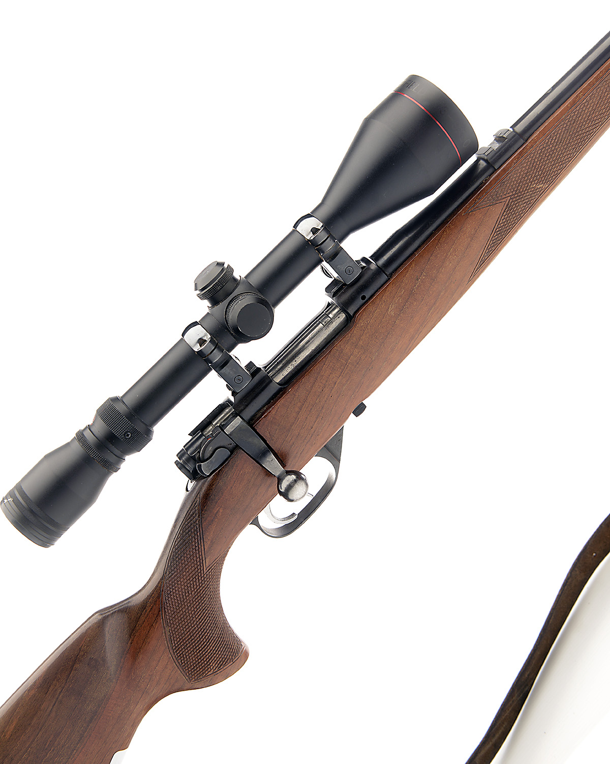 BRNO .222 'MODEL CZ 527' BOLT-MAGAZINE SPORTING RIFLE, serial no. 45029, 23 3/4in. nitro barrel, ramp-mounted fore-sight, rear-sight missing, fitted with a Simmons 3-9x40 telescopic sight, manual safety, detachable magazine (missing), set triggers, 13 5/8in. pistolgrip stock, leather sling