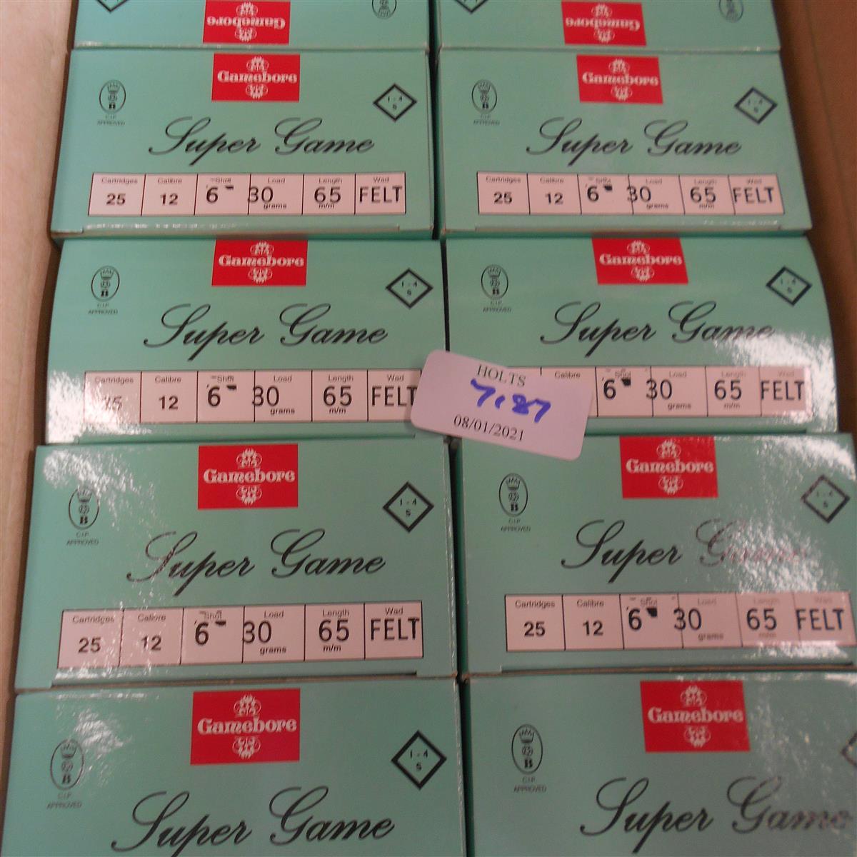 250 GAMEBORE 12 BORE 30 grm. 6 SHOT, SUPER GAME , FELT WAD, 2 1/2in. CARTRIDGES Please be advised that ammunition, primers, primed cases, blanks and percussion caps cannot be sent to you by post or carrier. If you wish you can book a collection at one of our regional valuation days or collect from our offices at PE31 6HA in Norfolk