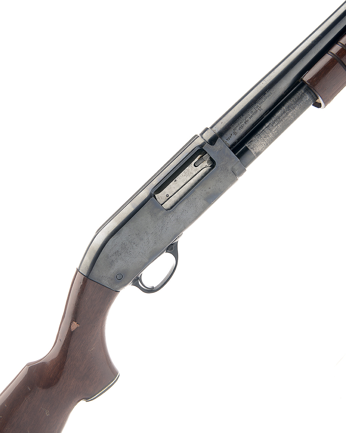 SQUIRES BINGHAM 12-BORE 'MODEL 30' PUMP-ACTION SHOTGUN, serial no. 727660, restricted magazine, 24in. ribless nitro barrel, 2 3/4in. chamber, bored approx. true cyl. choke, manual button safety, plain blacked action, 14 1/4in. pistolgrip stock including buttplate