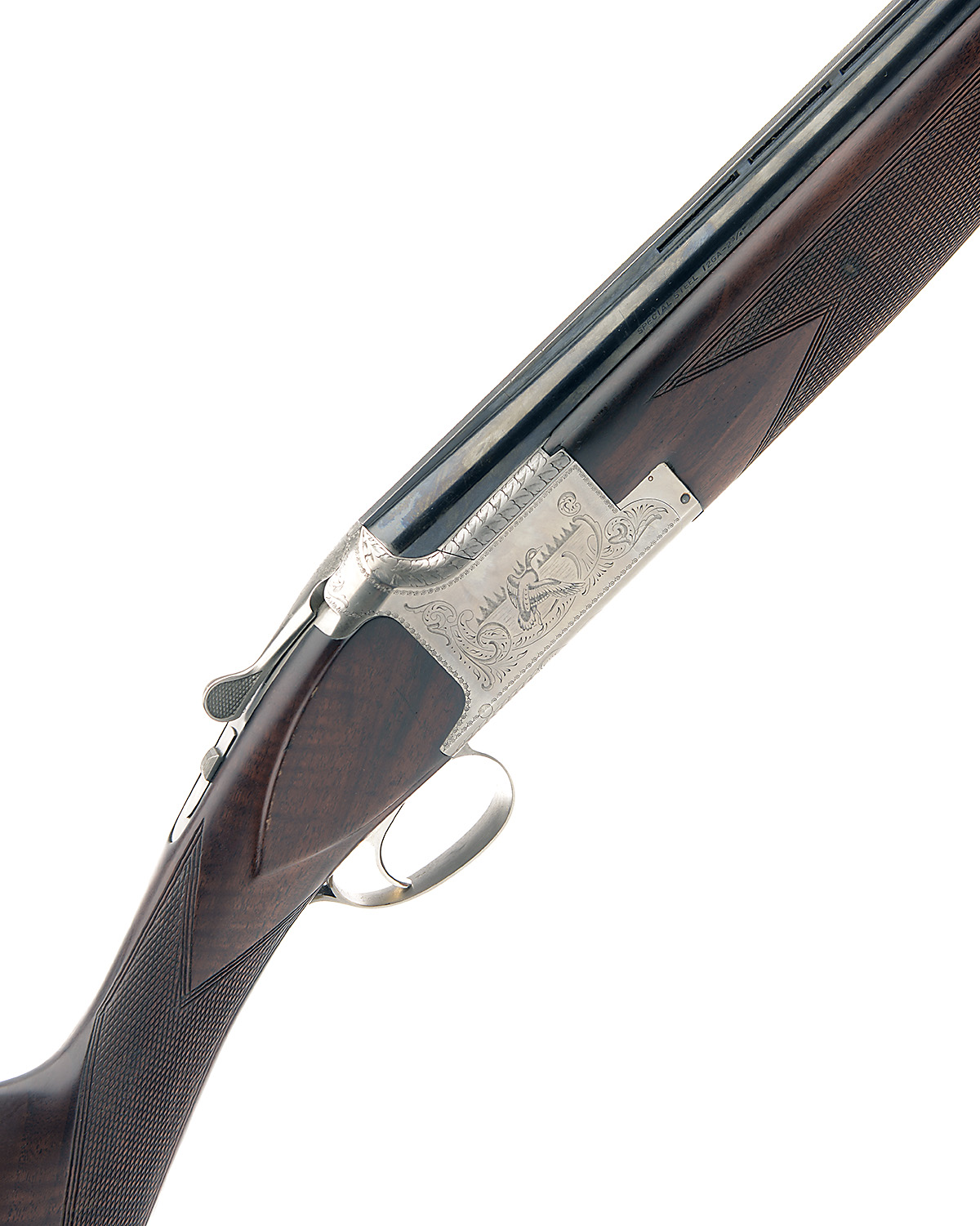 BROWNING ARMS COMPANY 12-BORE SINGLE-TRIGGER OVER AND UNDER EJECTOR, serial no. 251PV22059, 27 1/2in. nitro barrels with 6mm ventilated matt top-rib, 2 3/4in. chambers, multichokes (no spares), hold-open toplever, manual safety with integral barrel selector switch, border engraving surrounding vignettes of pheasant and mallard, silver finish, 13 3/4in. roachbelly stock including buttplate, weight 7lb. 1oz.