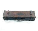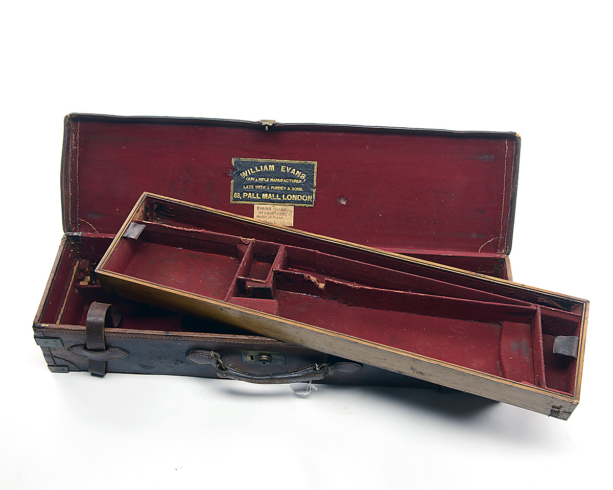A WILLIAM EVANS BRASS-BOUND LEATHER TWO-TIER DOUBLE GUNCASE, fitted for 30in. barrels, the interior lined with red baize, a William Evans trade label, top tier for gun no. 1, the under tier for gun 2, brass lock (key missing), a brass corner missing