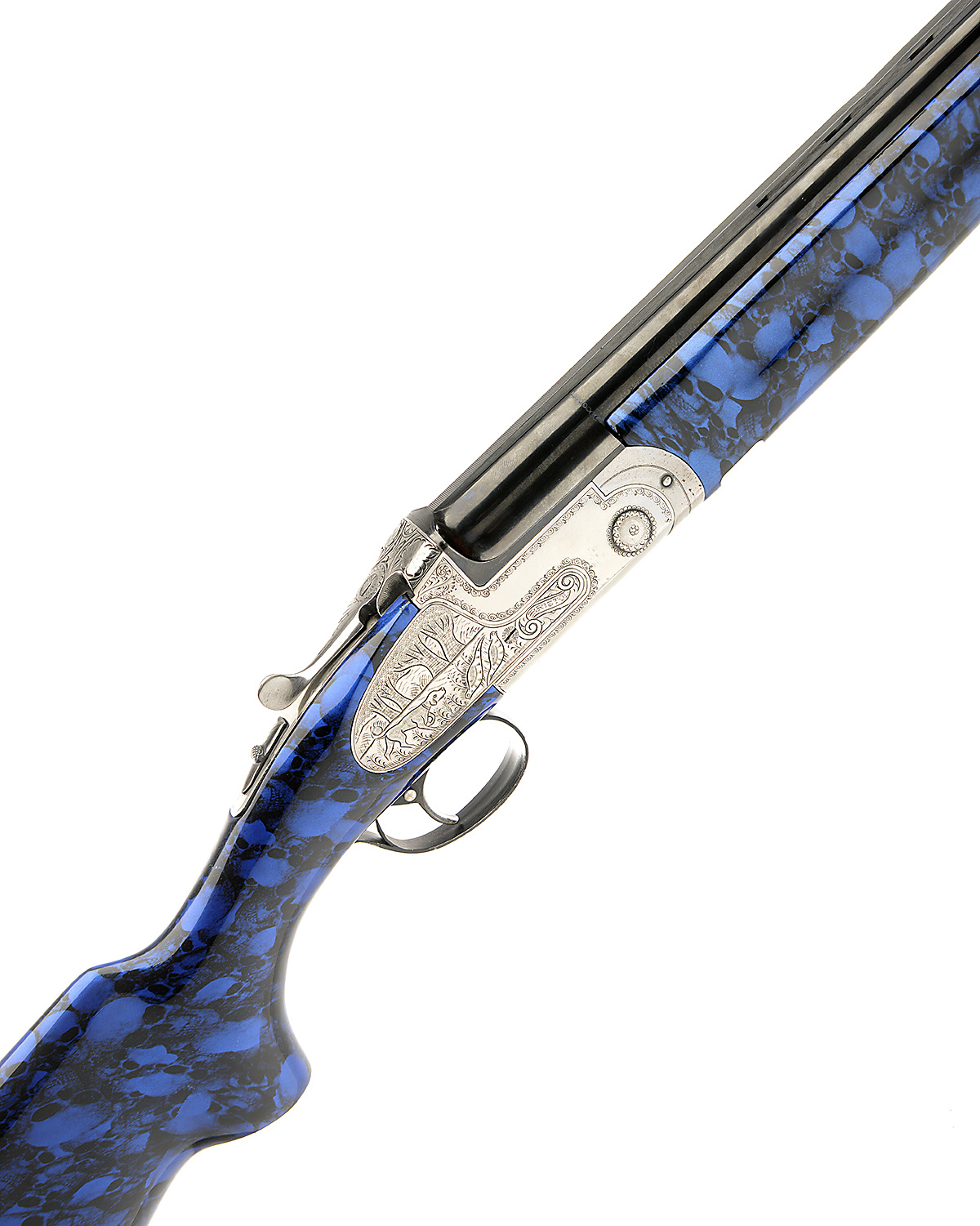 F. SARRIUGARTE 12-BORE 'BRISTOL' SINGLE-TRIGGER SIDEPLATED OVER AND UNDER EJECTOR, serial no. 78490, 28in. ported nitro barrels with 7mm ventilated matt top-rib, 2 3/4in chambers, bored approx. imp. cyl. and 3/4 choke, hold-open toplever, manual safety, trigger with barrel selector switch, border engraving surrounding vignettes of game, bright finish, 14 3/4in. pistolgrip stock including 1in. ventilated rubber recoil pad, the woodwork dipped with blue skull-effect finish
