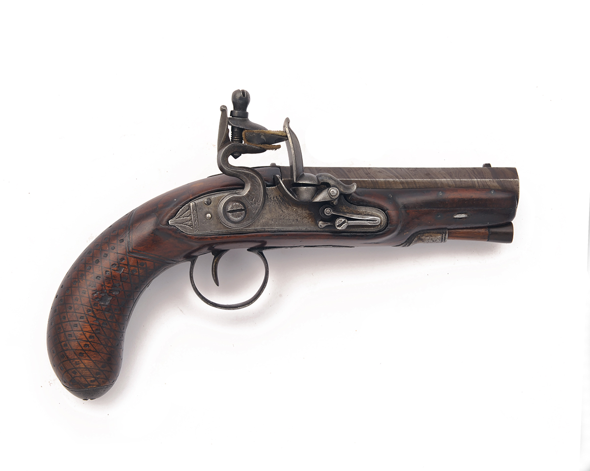 A 22-BORE FLINTLOCK OVERCOAT-PISTOL SIGNED GURD (OF CORK), no visible serial number