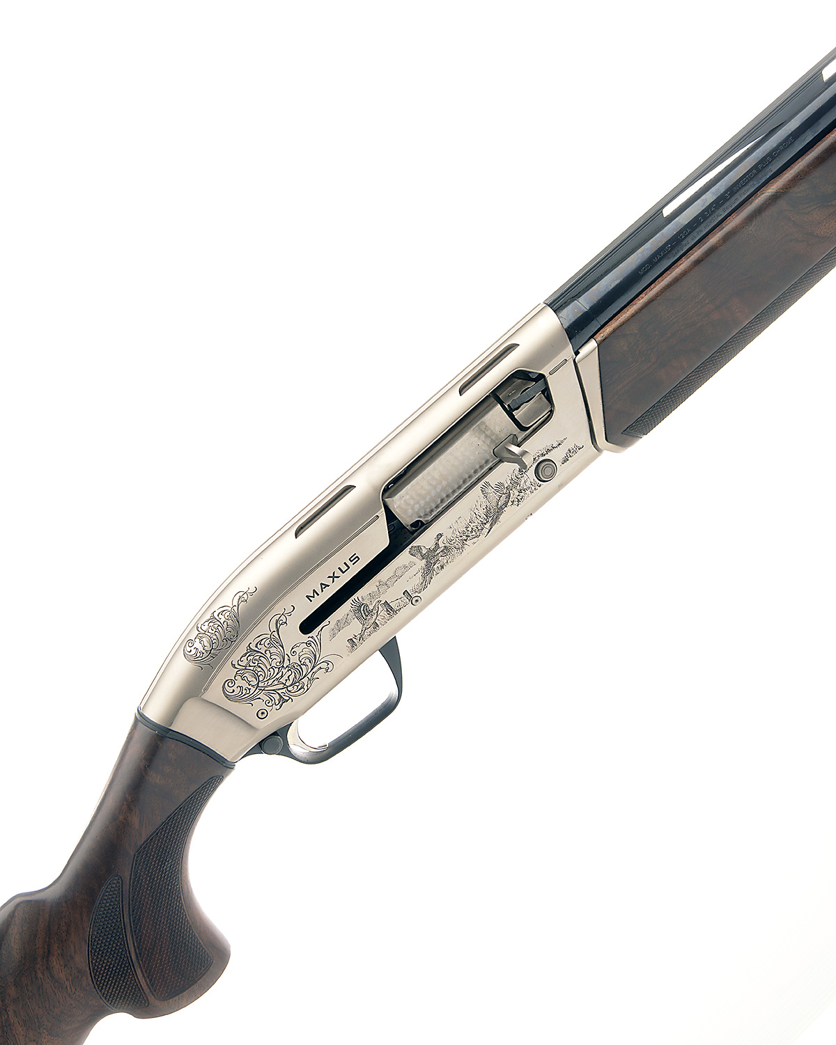 BROWNING 12-BORE (3IN.) 'MAXUS' SEMI-AUTO SHOTGUN, serial no. 115ZY02511, restricted magazine, 28in. nitro barrel with 6mm ventilated matt rib, 3in. chamber, multichoke (with spares), manual button safety, magazine cut-off switch, alloy action engraved with acanthus scroll surrounding game scenes, 14 3/4in. figured pistolgrip stock including rubber recoil pad, weight 6lb. 15oz., in its makers case with paperwork