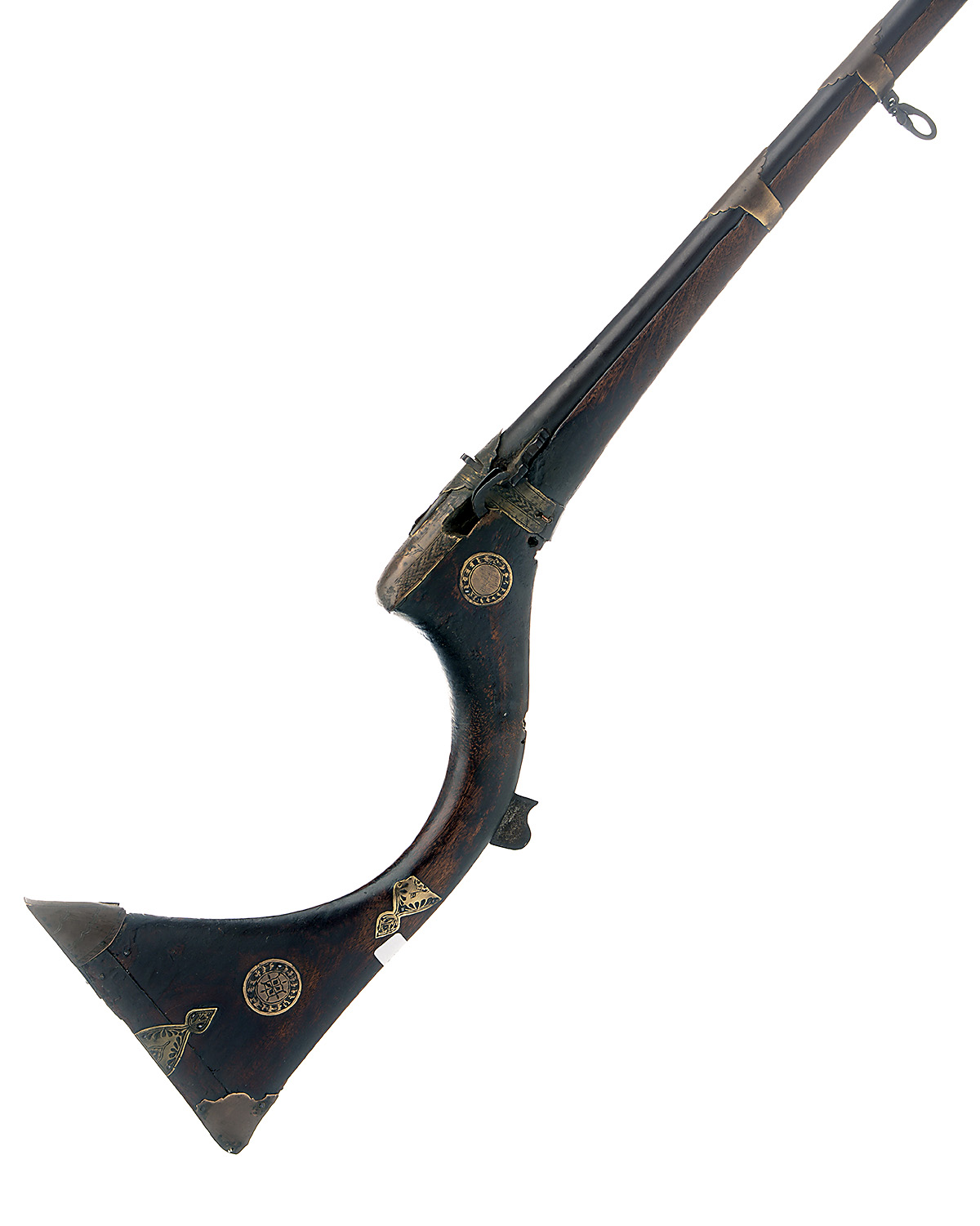 AN INDO-PAKISTANI 28-BORE MATCHLOCK JEZAIL, with 48 1/2in. barrel flared at the muzzle, hardwood half-stock, sheet metal decoration and reinforcement, fan-tailed butt and hatchet trigger