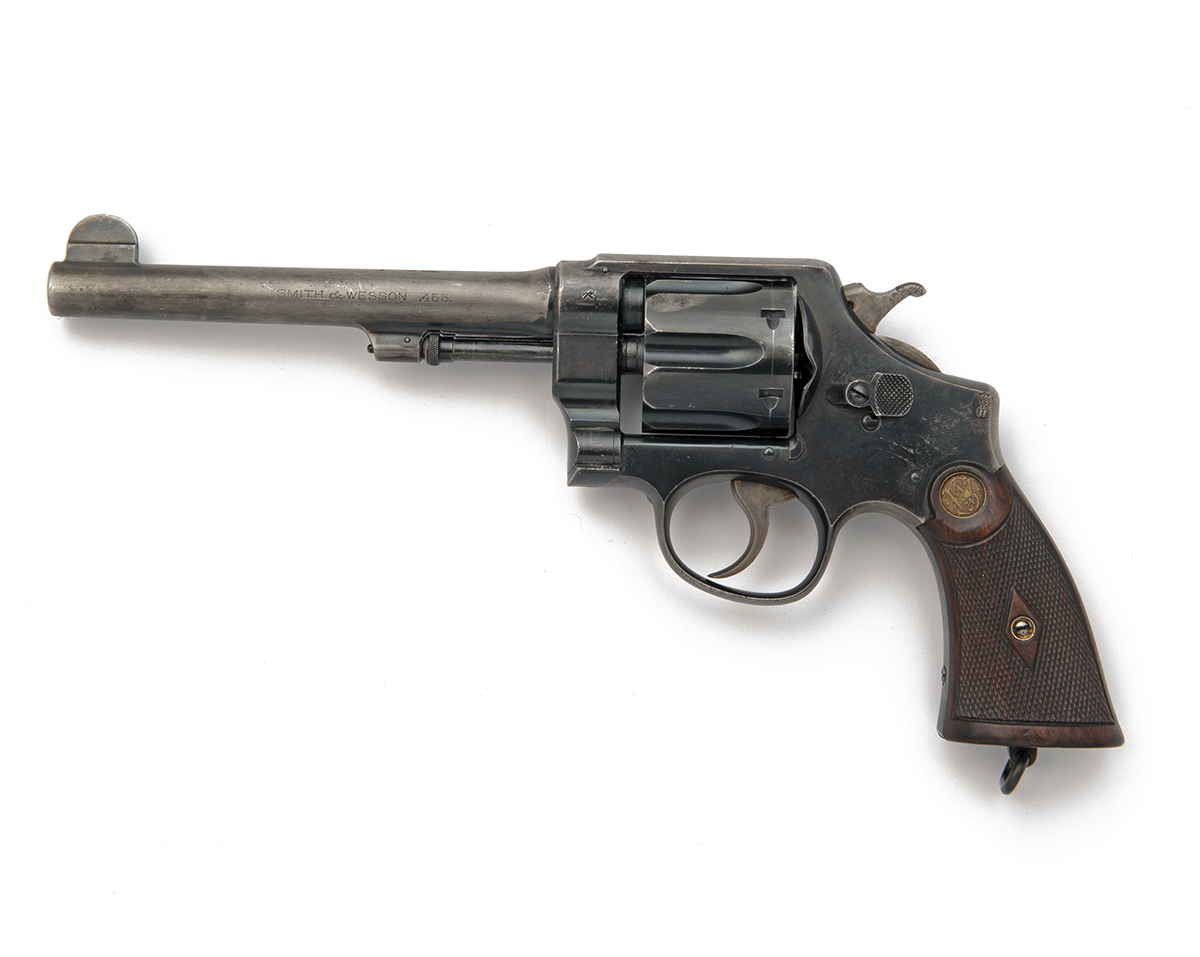 circa 1916, with round 6 1/2in. barrel (finish faded), crescent fore-sight, solid blued frame with swing-out fluted auto-ejecting cylinder, colour hardened hammer and trigger with double action mechanism and chequered walnut grips with inset trademarked medallions.