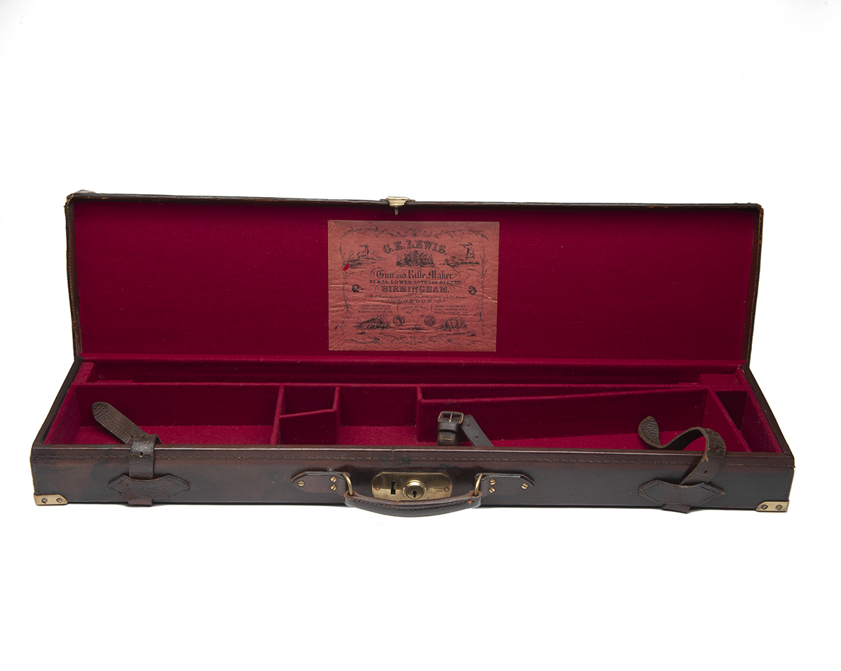 fitted for 30in. barrels, the interior lined with maroon baize, a G.E. Lewis trade label, brass lock (key missing)
