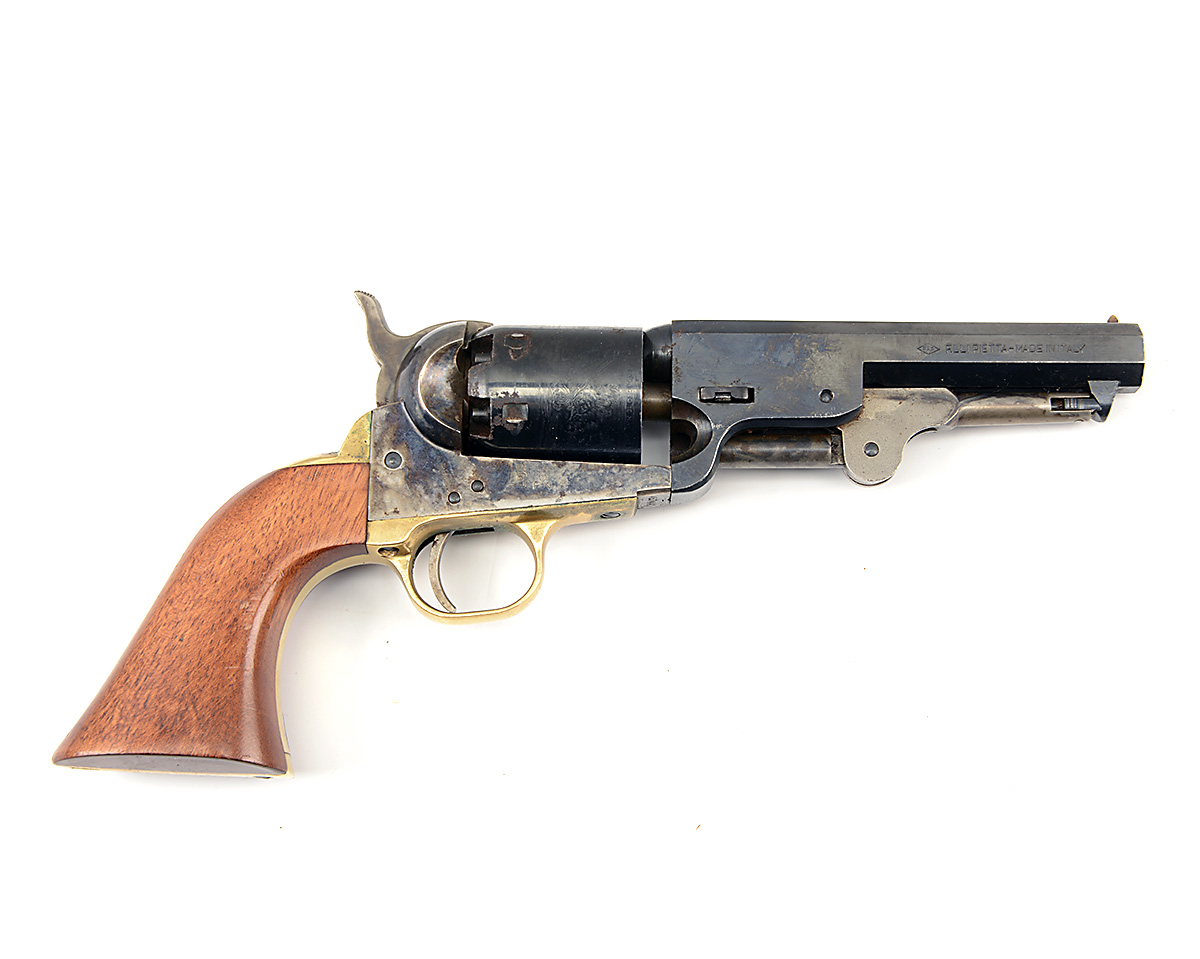A REPRODUCTION .36 PERCUSSION REVOLVER SIGNED PIETTA, MODEL '5in. NAVY', serial no. 457441, with blued octagonal 5in. barrel, colour hardened open frame, brass grip-straps and smooth walnut grips