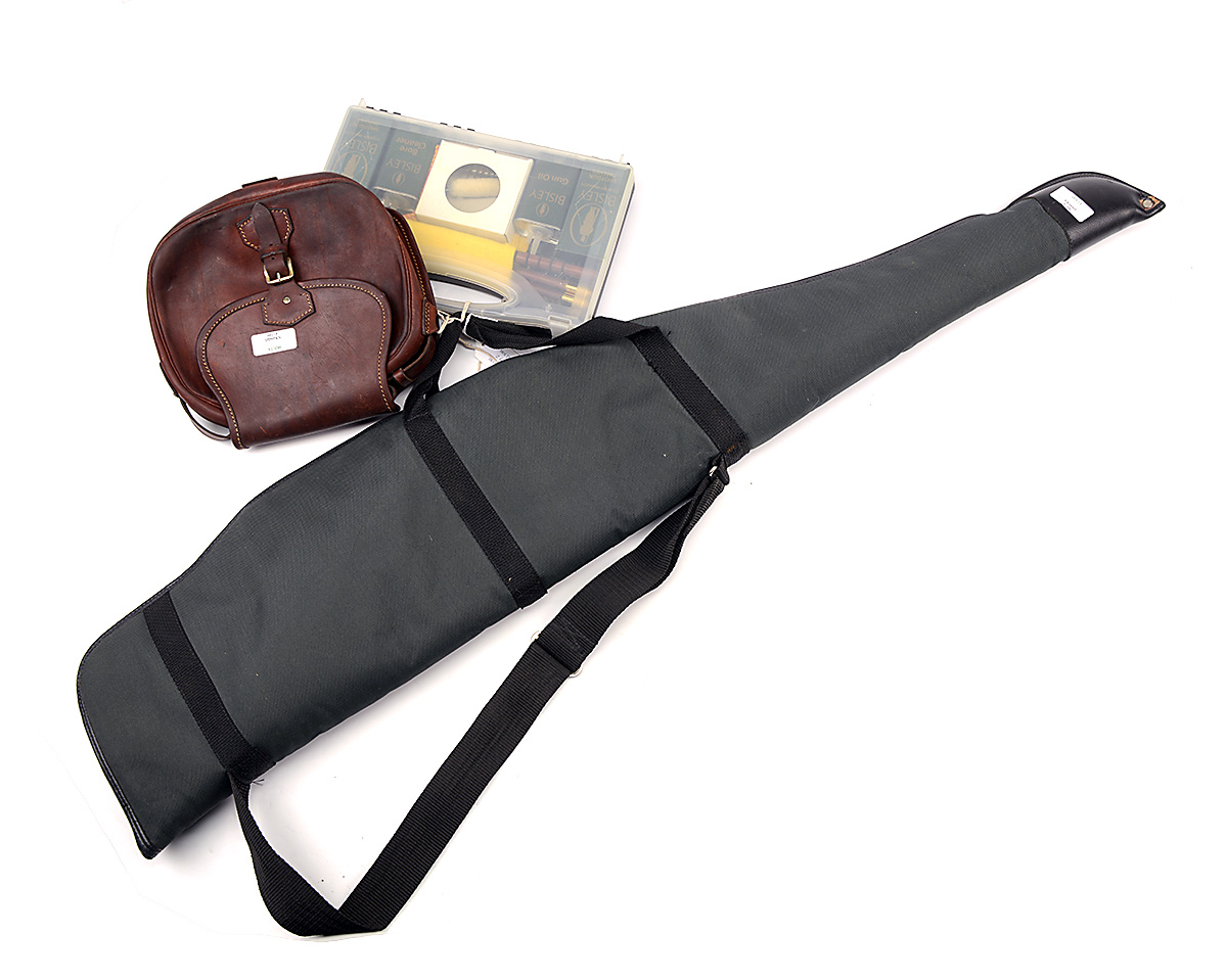 A COLLECTION OF SHOOTING RELATED ITEMS, comprising of a rifle slip, a cartridge magazine, a 12-bore cleaning kit, two cleaning rods